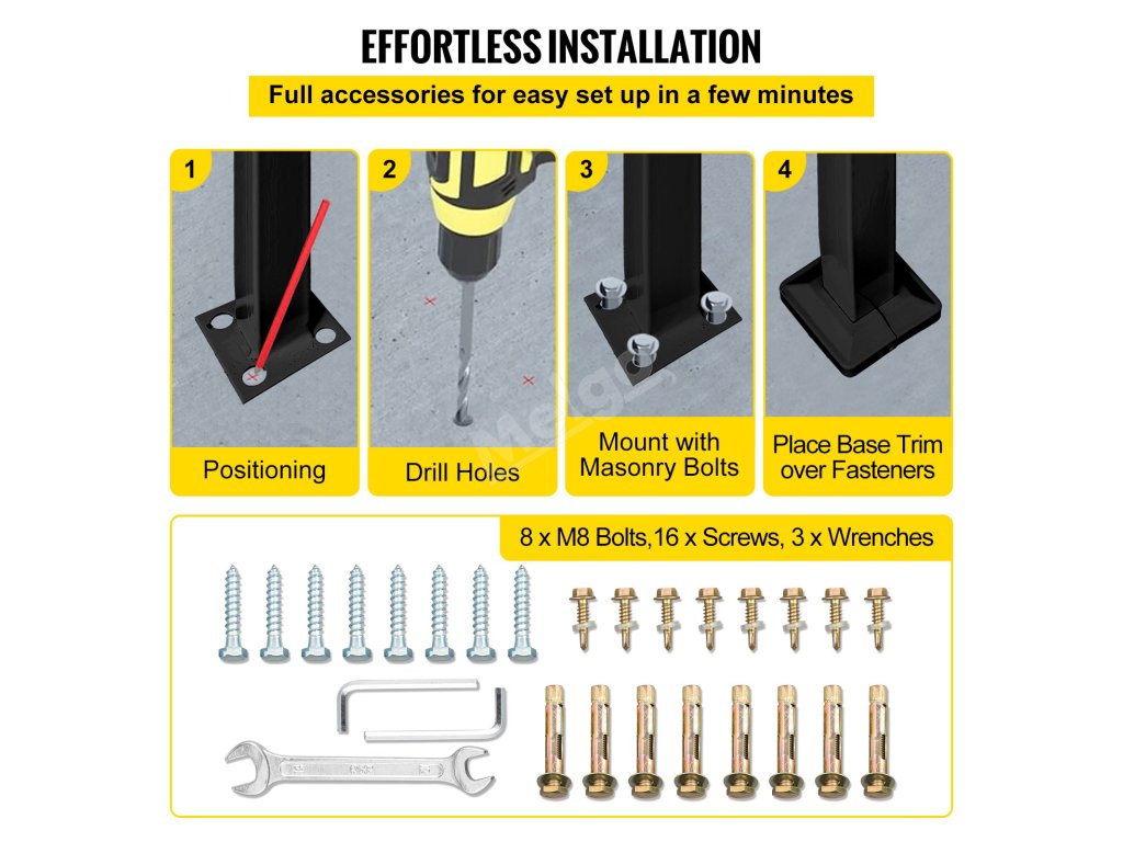 Sada betonového schodišťového zábradlí obsahuje vše, co potřebujete k upevnění zábradlí a sloupků na schody. Instalace je jednoduchá a kompletní montáž zabere několik minut.