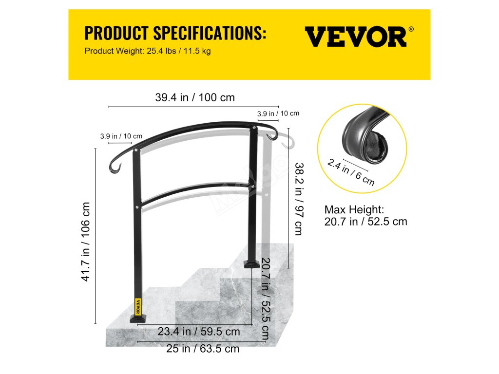 Toto kované zábradlí, které je skvělým pomocníkem pro členy vaší rodiny při chůzi po schodech, se hodí na 3 schody. Překlenuje maximálně 3 schodišťové stupně a měří 25 cm od balustrády k balustrádě.