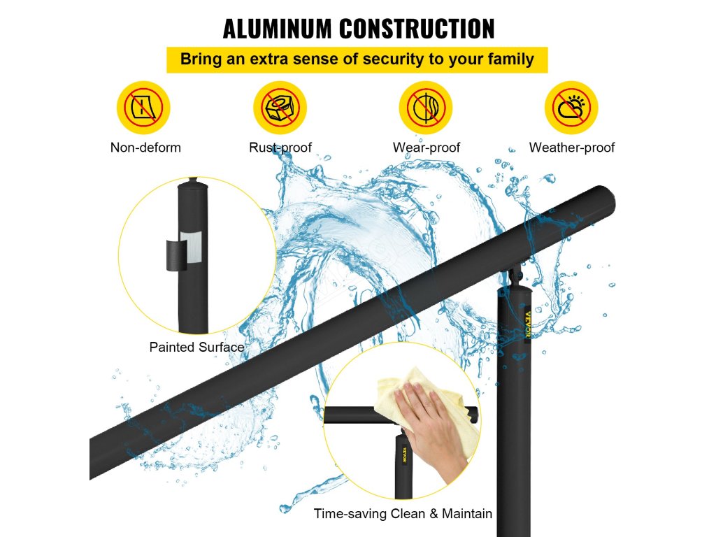 Naše hliníkové zábradlí unese zatížení až 155 liber/70 kg. 0.trubky o tloušťce 08" /2 mm/ a zesílená základna o tloušťce 0,2" / 5 mm poskytují mimořádnou stabilitu a pevnou oporu, která se obtížně deformuje nebo ohýbá.