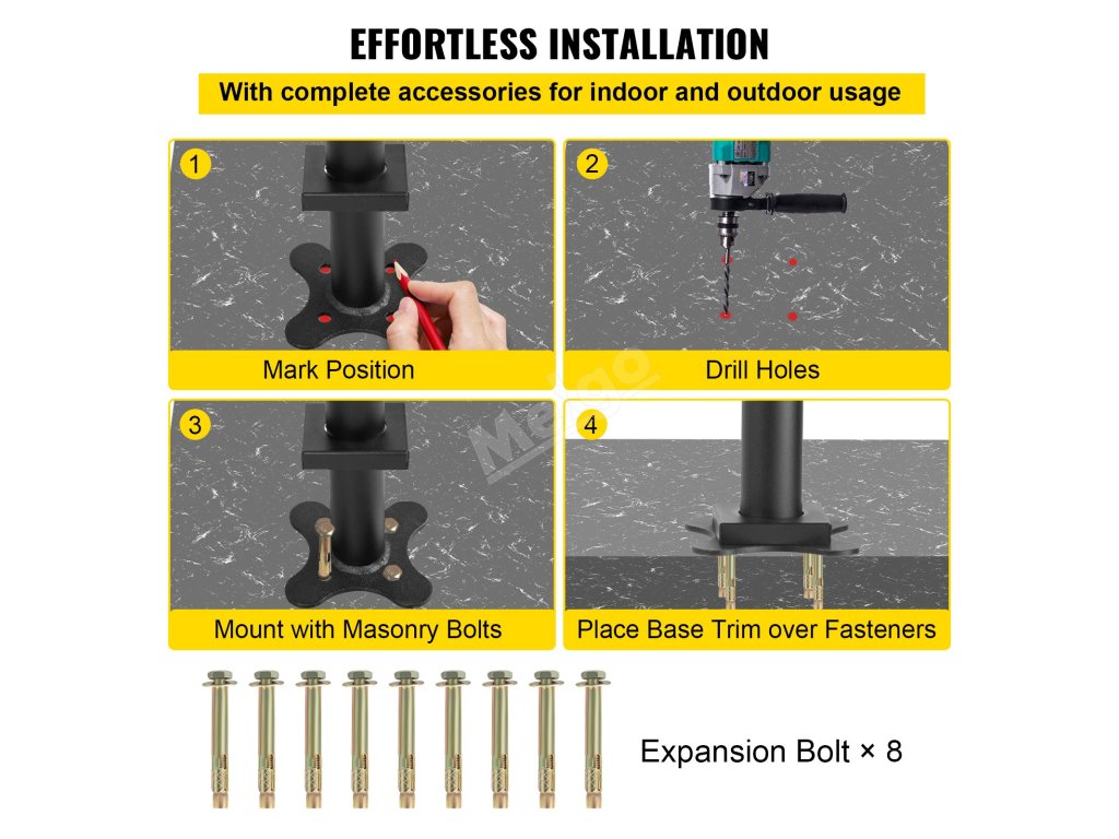 Dodává se s předvrtanými otvory a všemi potřebnými rozpěrnými šrouby. Sada zábradlí pro vnější schody se snadno připevní k zábradlí a sloupkům na schodech.