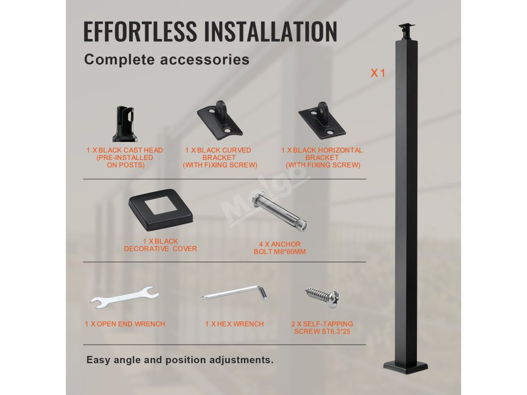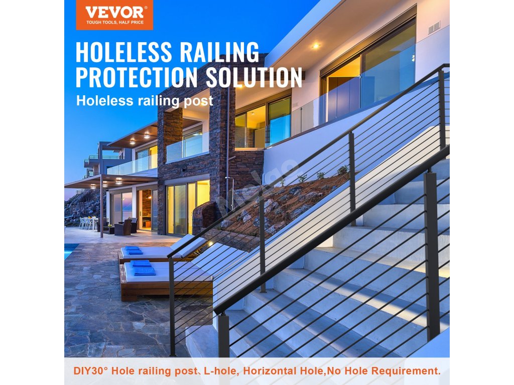 Základna našeho sloupku zábradlí je dodávána s předvrtanými otvory, takže při instalaci není nutné další vrtání. Úhel a polohu můžete během instalace snadno upravit pomocí přiloženého příslušenství, což šetří práci.