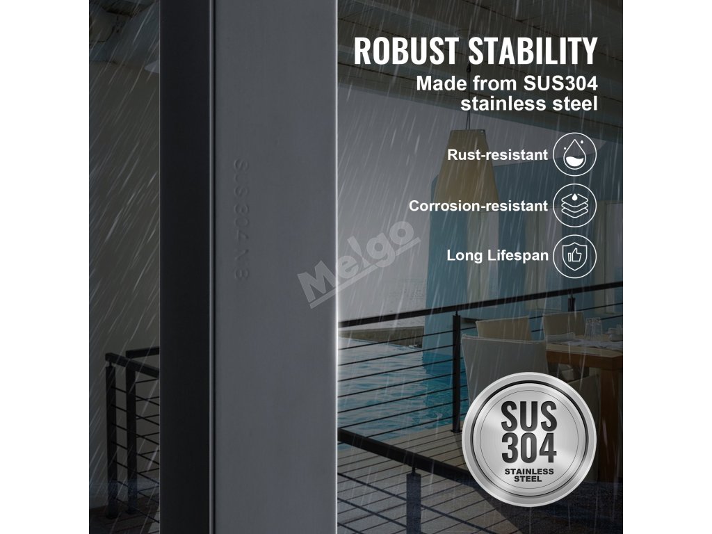 Náš sloupek kabelového zábradlí je vyroben z nerezové oceli SUS304 odolné proti korozi a rzi, což zaručuje dlouhou životnost i v náročných povětrnostních podmínkách nebo při působení korozivních látek. Nedoporučuje se však pro projekty na moři.