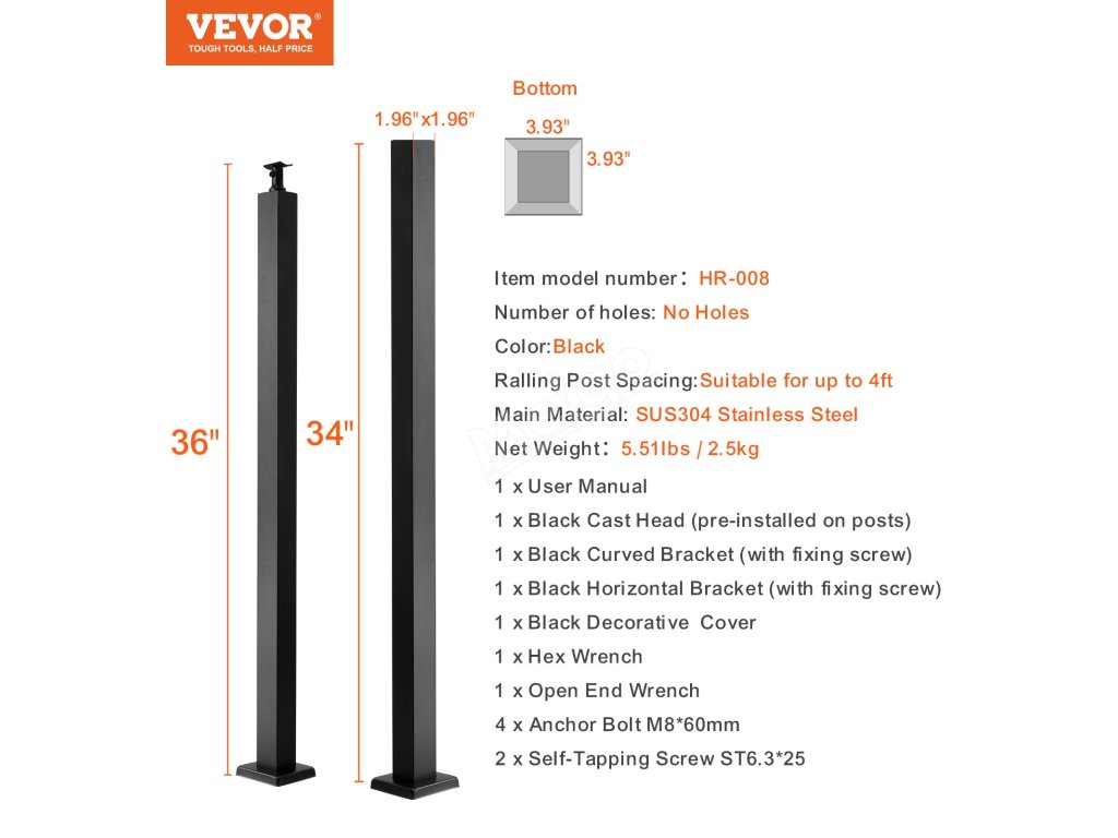Zábradlový sloupek 36×2×2in/91.4×5.1×5.1cm ocel bez otvorů 1ks černý