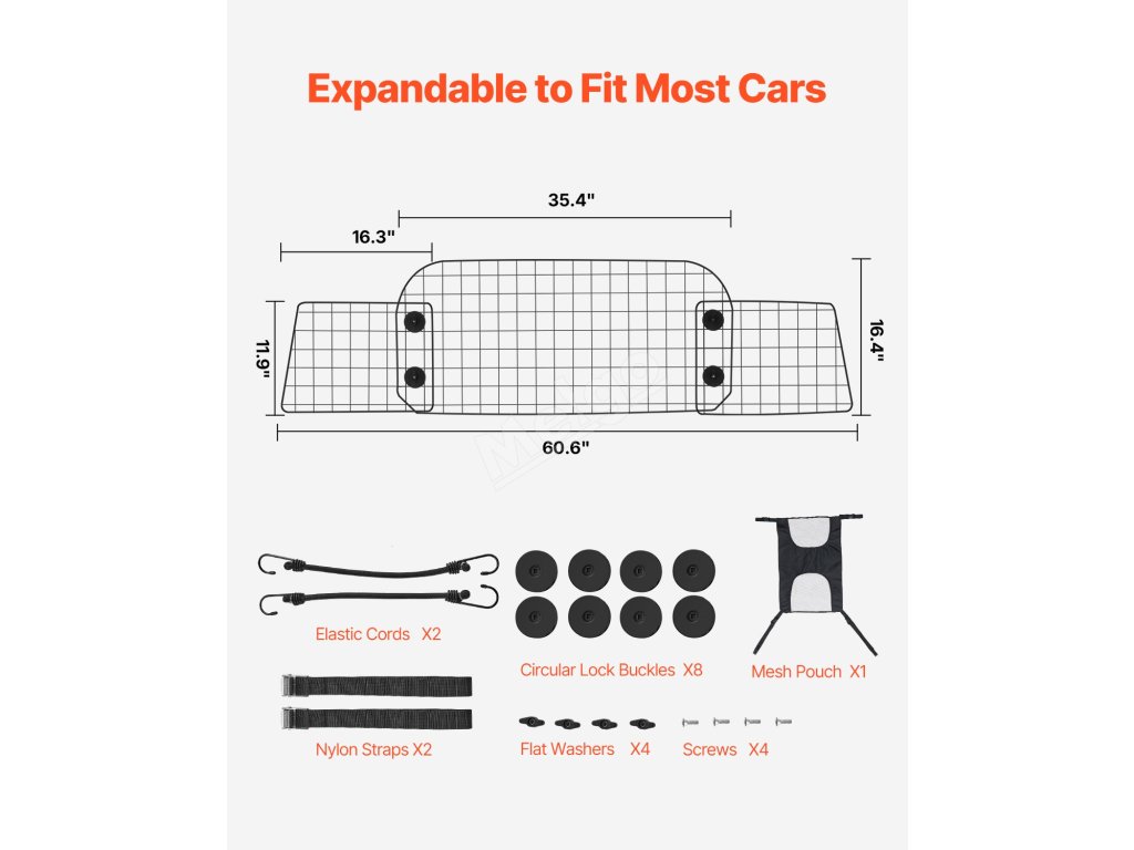 Tato zábrana pro psy pro vozy SUV nabízí až 6 kombinací tvarů, které se rozšiřují až na 60,6 palce (1539 mm). Snadno se nastavuje a rozšiřuje, aby se vešla do různých vozů SUV, dodávek, džípů a hatchbacků.