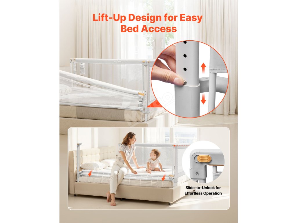 Zábranu lůžka lze zvednout nebo spustit jednou rukou. Přes den ji můžete spustit, abyste měli volný přístup nebo si mohli hrát u postele; v noci ji můžete zvednout, abyste měli větší ochranu a klid.