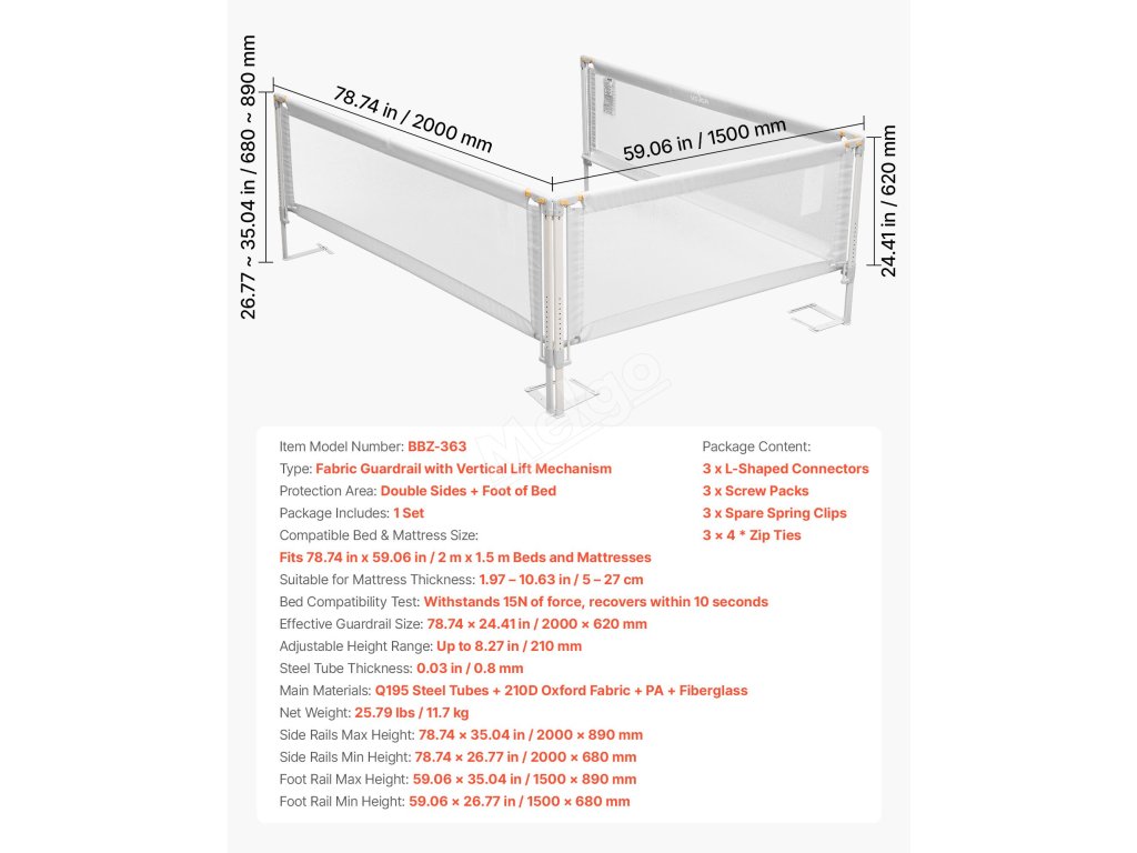 | Kompatibilní velikost postele a matrace | Vhodné pro postele a matrace o rozměrech 78,74 x 59,06 palce / 2 x 1,5 m |