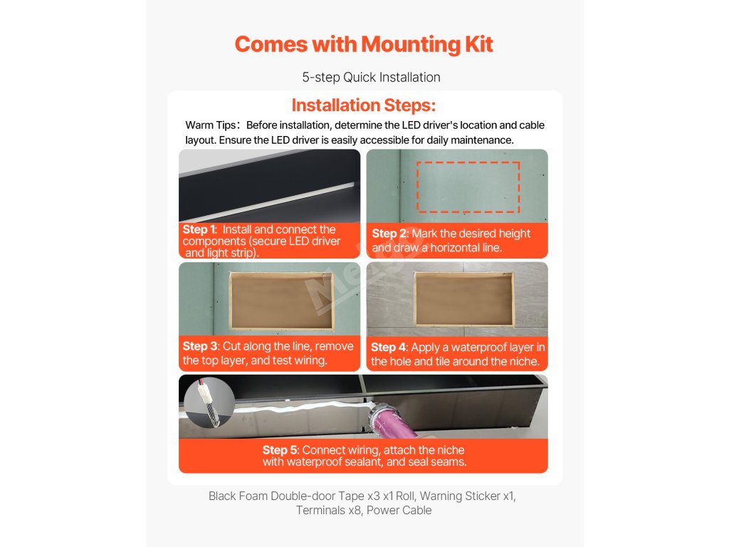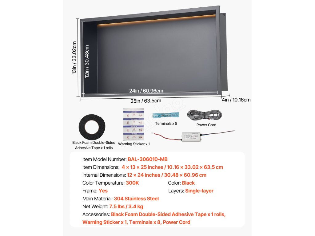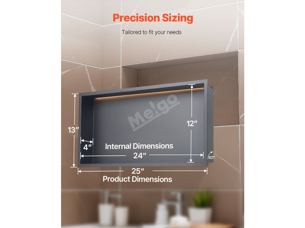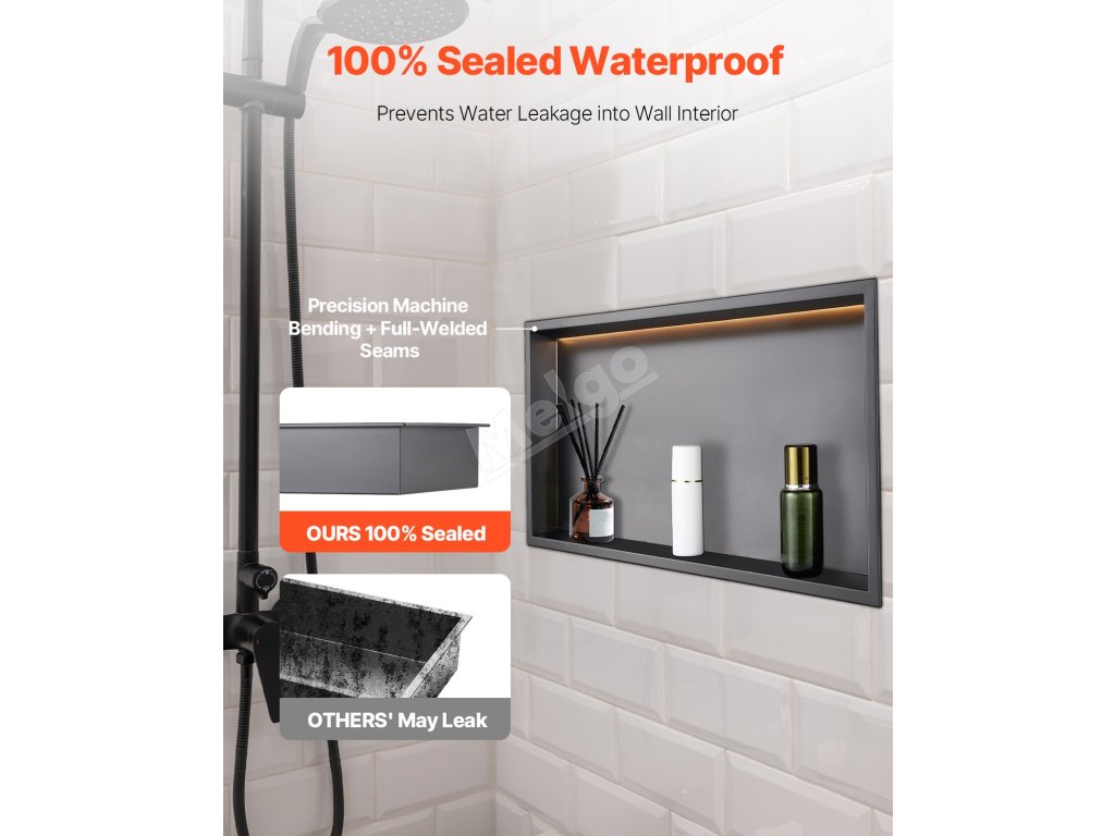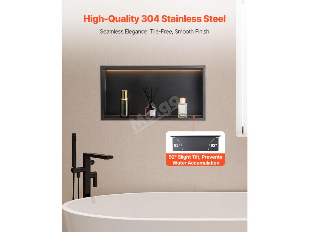 Sprchová nika VEVOR je vyrobena z nerezové oceli 304, je 100% utěsněná a vodotěsná, má povrchovou úpravu odolnou proti korozi, snadno se čistí a je odolná proti poškrábání. Je vybaven předinstalovanou dutou policí, která zabraňuje hromadění vody, ideální do koupelen, šaten a kuchyní.