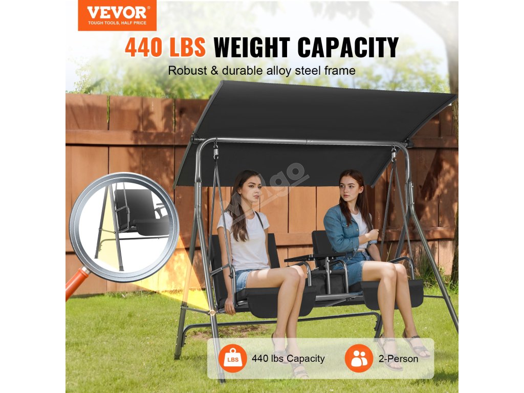 Toto závěsné křeslo na terasu vyrobené z legované oceli má robustní trojúhelníkovou nosnou konstrukci, která unese až 440 kg a pojme 2 osoby pro venkovní odpočinek.