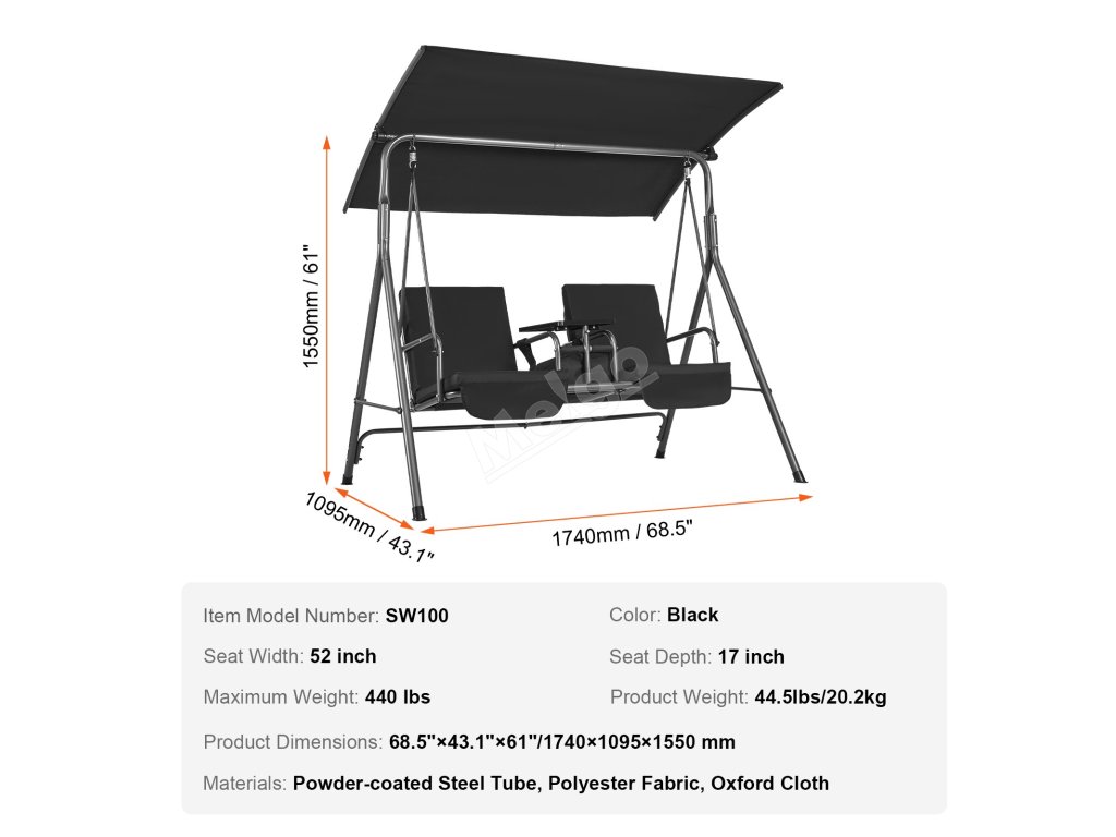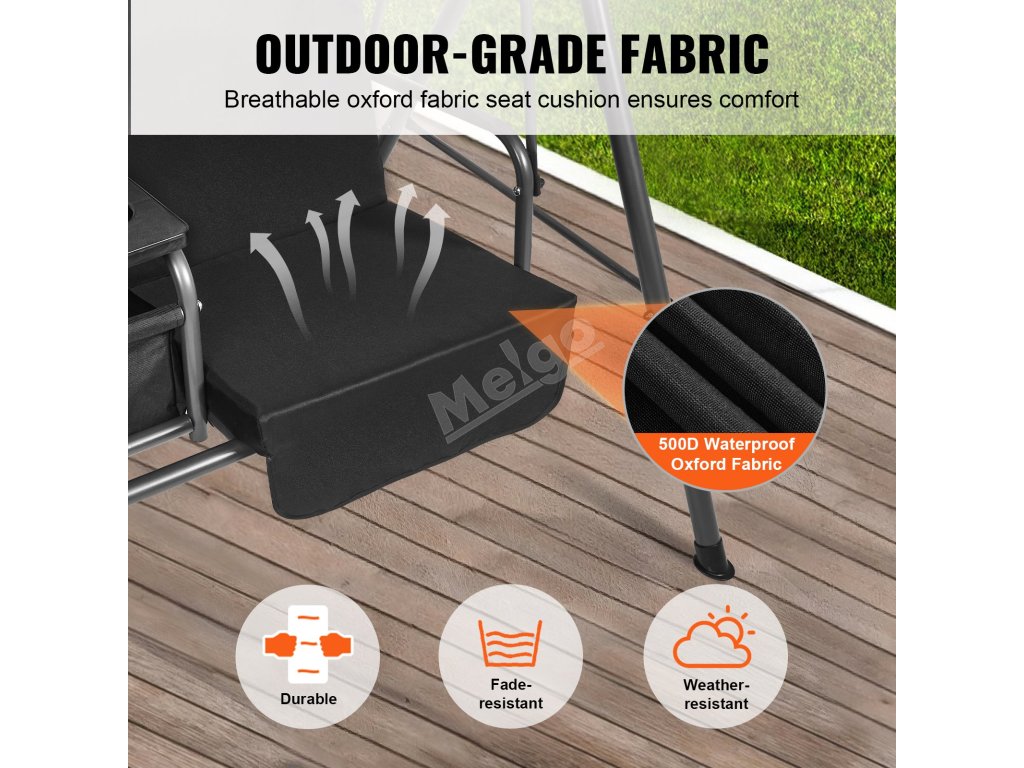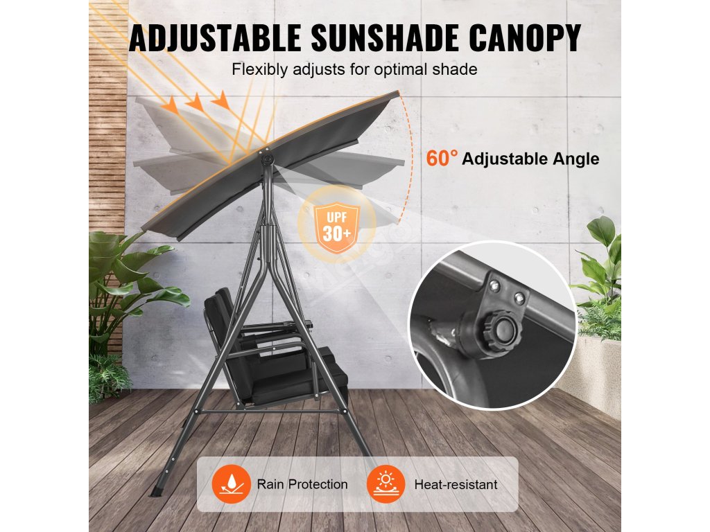 Horní stříšku slunečníku lze nastavit pomocí knoflíku až do úhlu 60°, aby bylo dosaženo optimálního účinku slunečního stínu. Houpačka na verandu je vyrobena z polyesterové tkaniny, která odolává blednutí i při vystavení venkovnímu prostředí.
