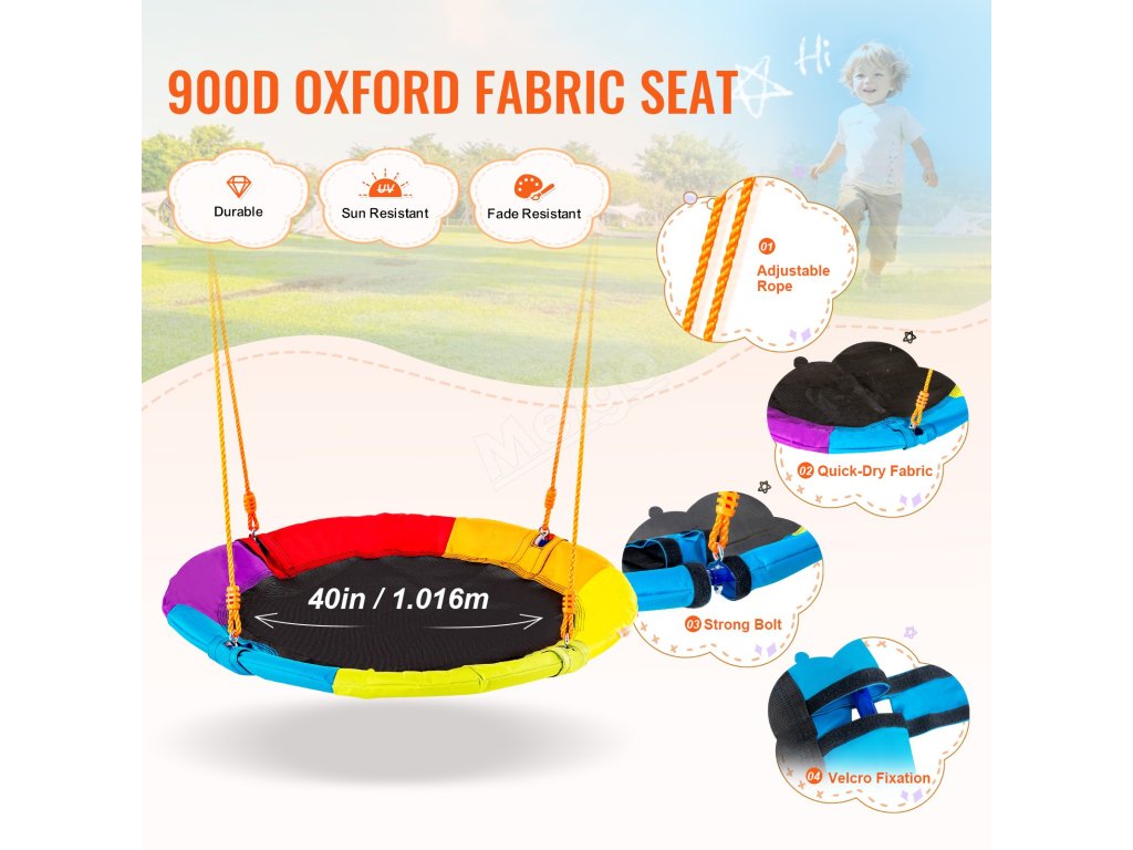Celková konstrukce houpačky je pevná, se silnými lany pro stabilní houpání. Bezpečnostní zámky z pozinkované oceli odolávají korozi a rzi, což zvyšuje odolnost. Sedátko z vysoce kvalitní tkaniny Oxford je odolné proti opotřebení a 4 hřebíky do země zajišťují dodatečnou stabilitu.