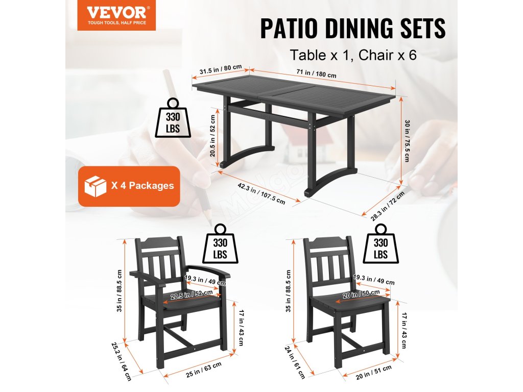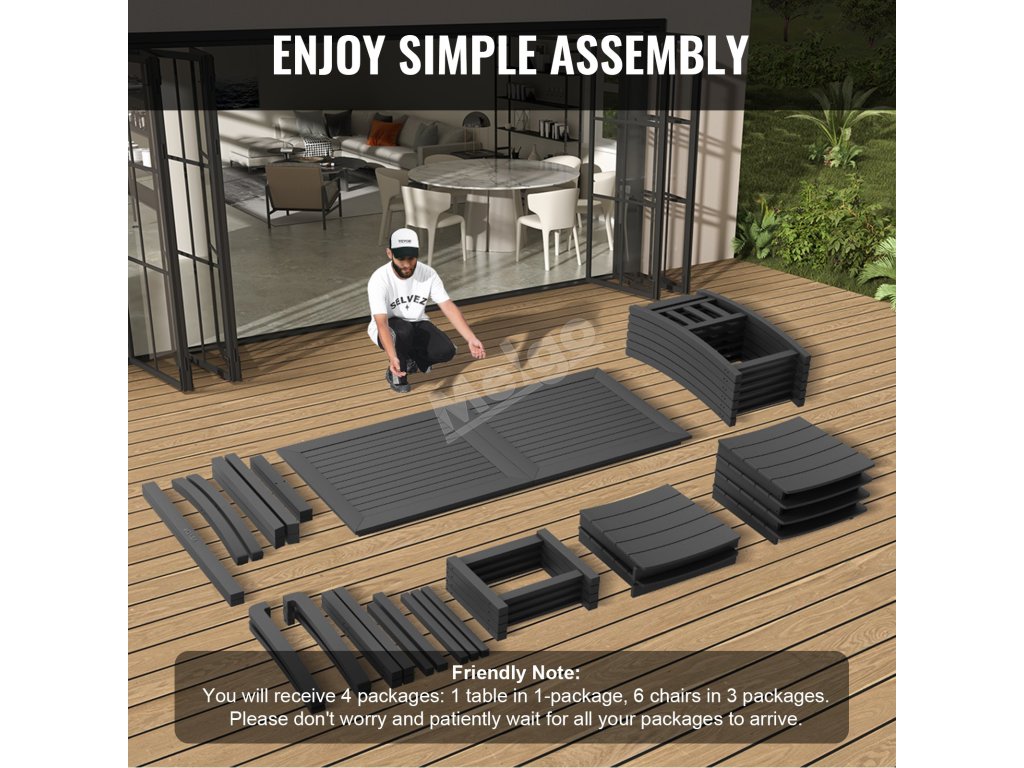 Sada se dodává ve 4 baleních (1 stůl v 1 balení, 6 židlí ve 3 baleních) pro snadnou a pohodlnou montáž.