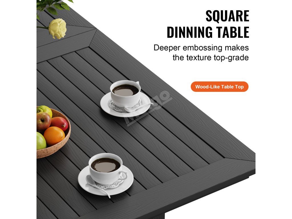 Stůl má hlubší reliéf, který zvýrazňuje texturu a dodává mu prvotřídní vzhled. Deska stolu připomínající dřevo dodá vašemu venkovnímu jídelnímu prostoru nádech elegance.
