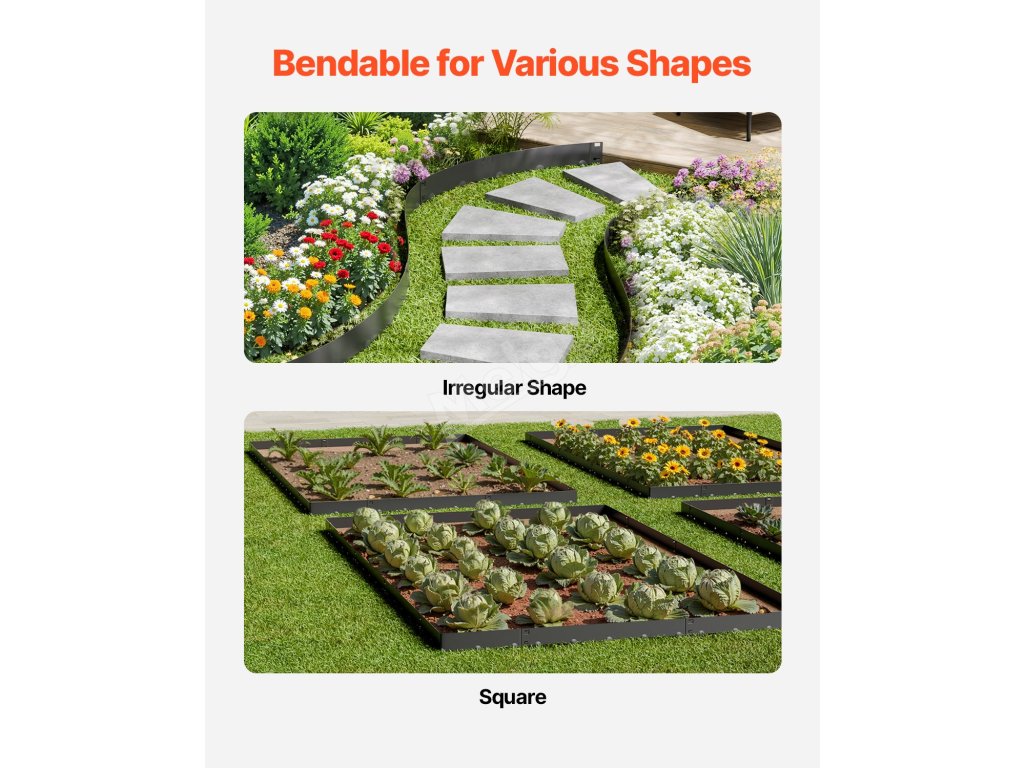Naše kovové krajinné obruby jsou vyrobeny z pozinkované oceli s práškovou povrchovou úpravou odolnou proti korozi a jsou konstruovány tak, aby odolávaly povětrnostním vlivům. Snadno se instaluje a je dostatečně pružná, aby se ohnula do jakéhokoli tvaru, takže je ideální pro vytváření ohraničení zahrad a okrajů cest. Efektivní řešení pro udržení pořádku v krajině.