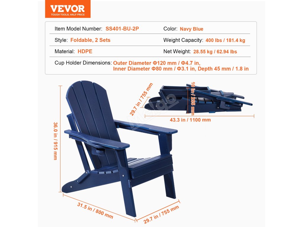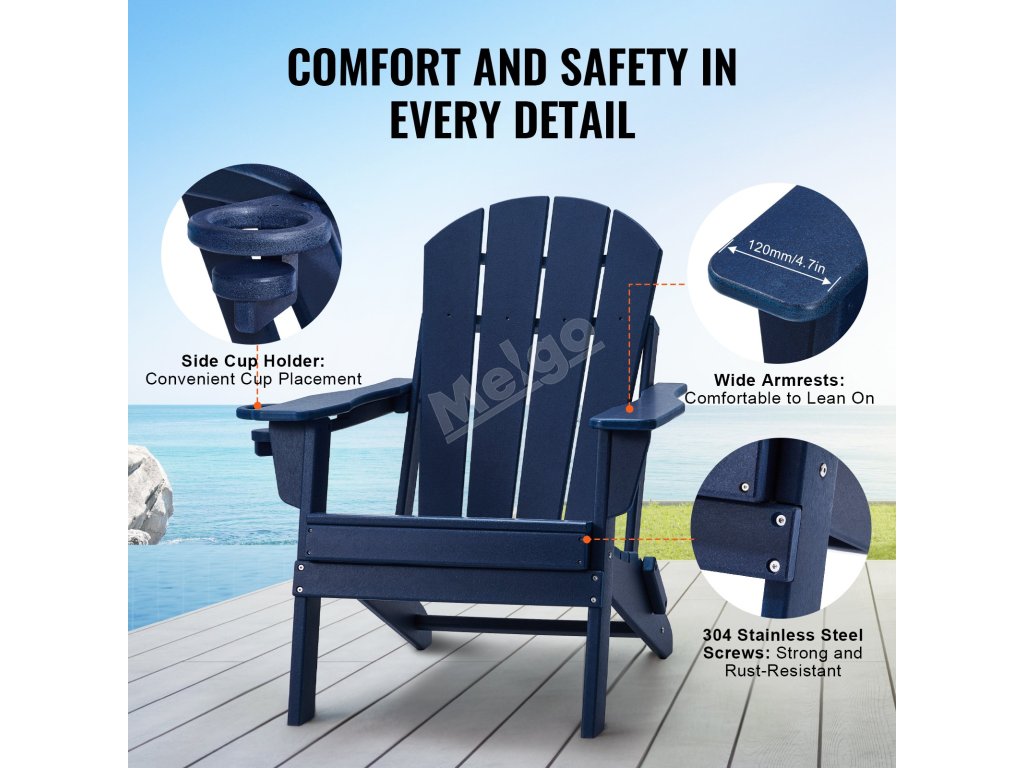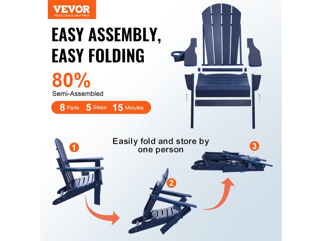 Naše židle Adirondack má skládací konstrukci pro snadné skladování. Montáž je rychlá a zabere pouze 15 minut pomocí elektrického šroubováku. Je vyrobeno z plastu HDPE, unese až 400 kg a odolá slunci, dešti i větru. Ideální na terasy, zahrady a pláže.