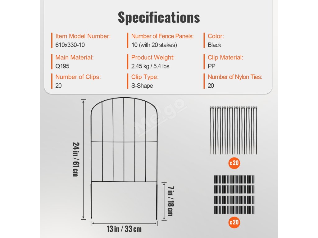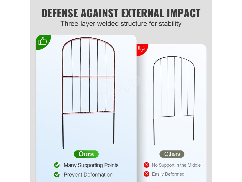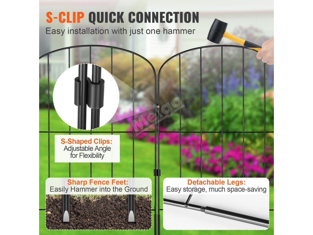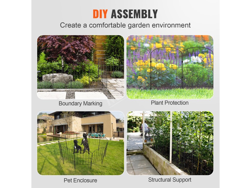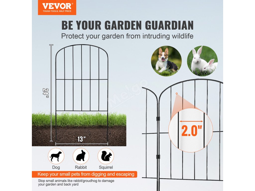 Tento 24 palců vysoký zahradní plot zabraňuje dětem a domácím mazlíčkům náhodně opustit dvůr nebo se dostat příliš blízko k nebezpečným oblastem. Dvoupalcový rozestup mezi hroty účinně brání vstupu velkých domácích zvířat a divoké zvěře a udržuje čistotu a klid.