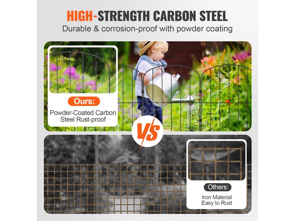Vysoce kvalitní uhlíková ocel je ošetřena práškovou barvou zabraňující korozi, která prodlužuje životnost kovového zahradního plotu.