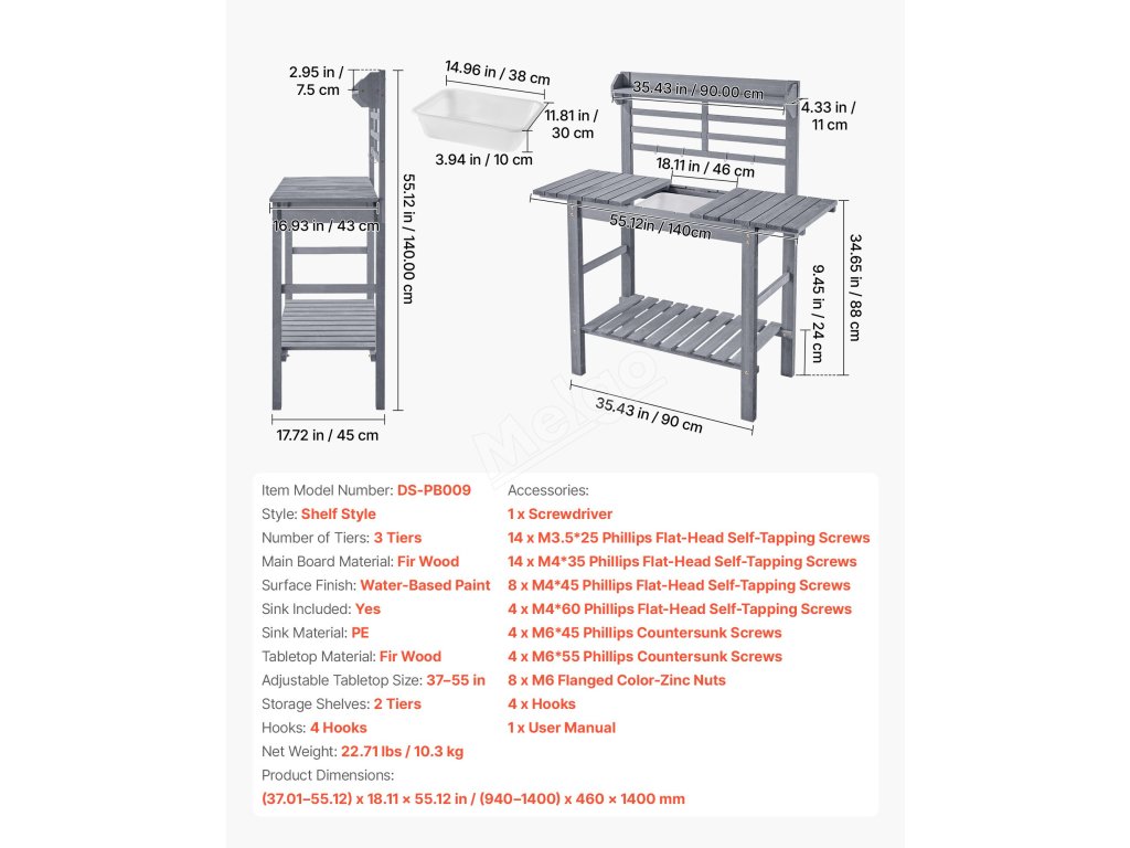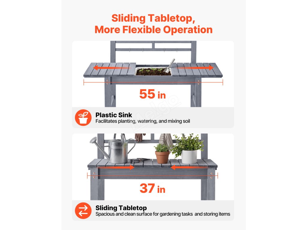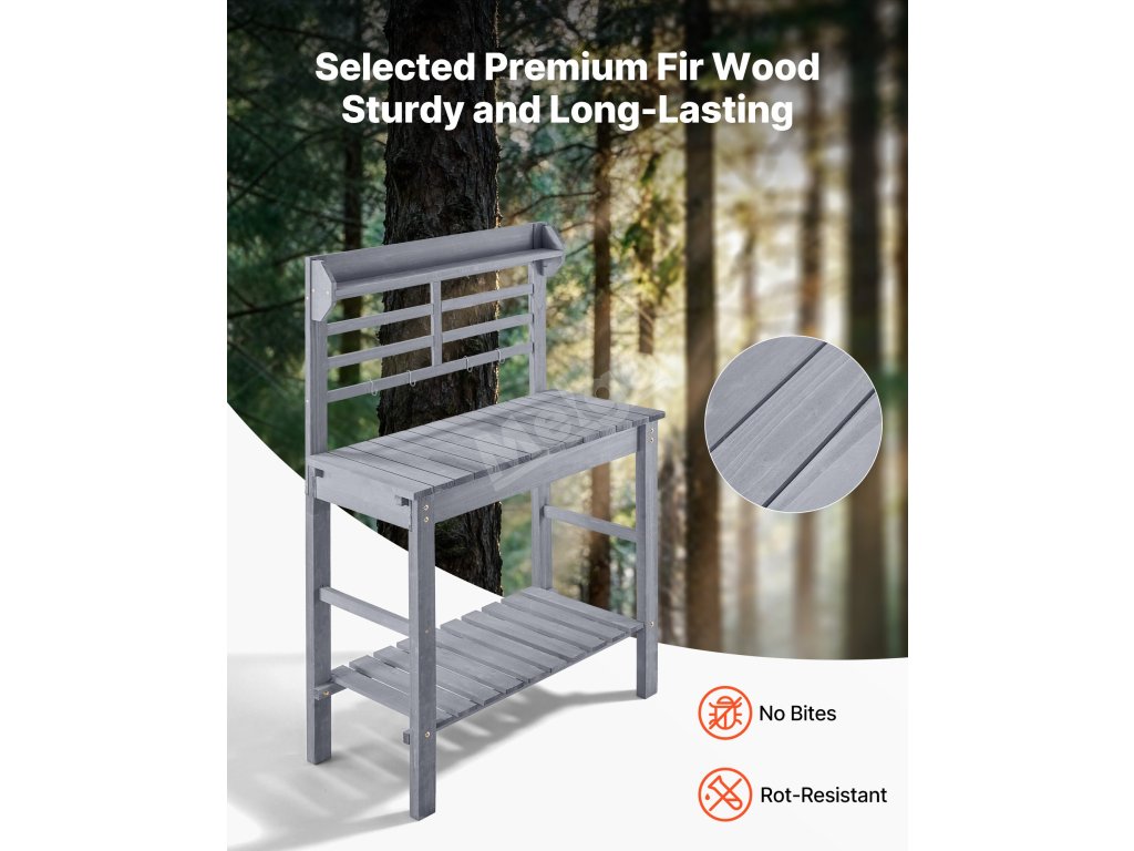 Zahradní pracovní stůl, dřevěná deska, dřez, 94-140 cm, police, šedý