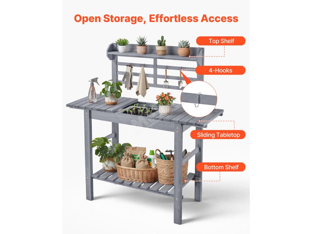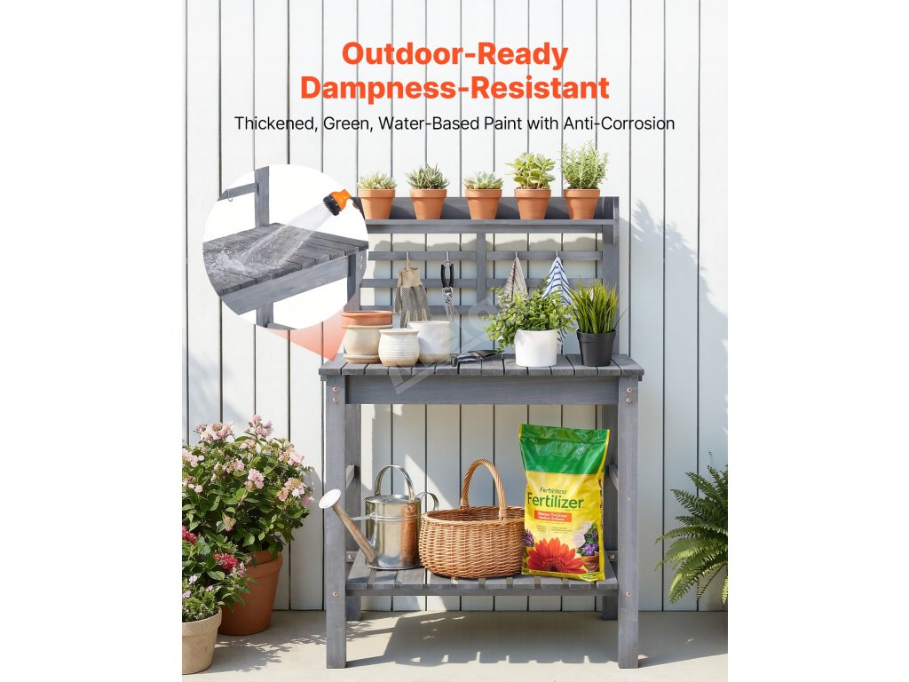 Tento venkovní stolek na sázení má horní polici na malé rostliny v květináčích, zatímco skříňka a spodní police slouží k uložení většího nářadí, hnojiva a dalších předmětů. Díky čtyřem háčkům jsou ručníky a rukavice pěkně po ruce.