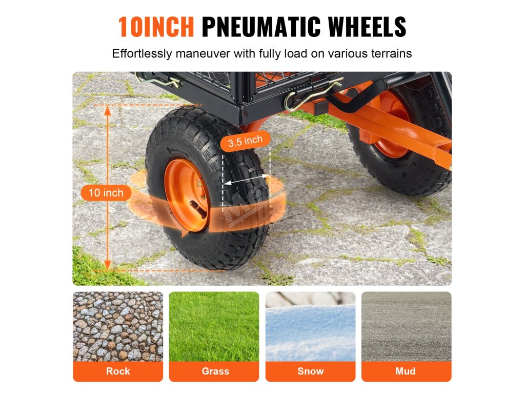 Tento zahradní vozík je vybaven velkými 10" gumovými koly, která zajišťují vynikající odolnost a tlumení nárazů a zajišťují hladký pohyb i na nerovném terénu. Díky 360° otočným kolům je otáčení bezproblémové, takže přeprava je hračka.