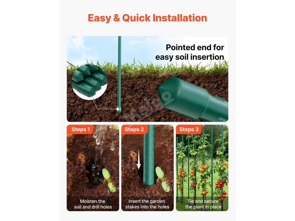 Tyto kůly na rajčata jsou vyrobeny ze zesílených kovových trubek, které zvyšují odolnost proti stlačení a pevnost, a zůstávají tak v půdě stabilní, aniž by se ohýbaly nebo deformovaly. Lze je použít vícekrát, účinně odolávají tahu rostlin a pohybu větru a poskytují dlouhodobou spolehlivost.