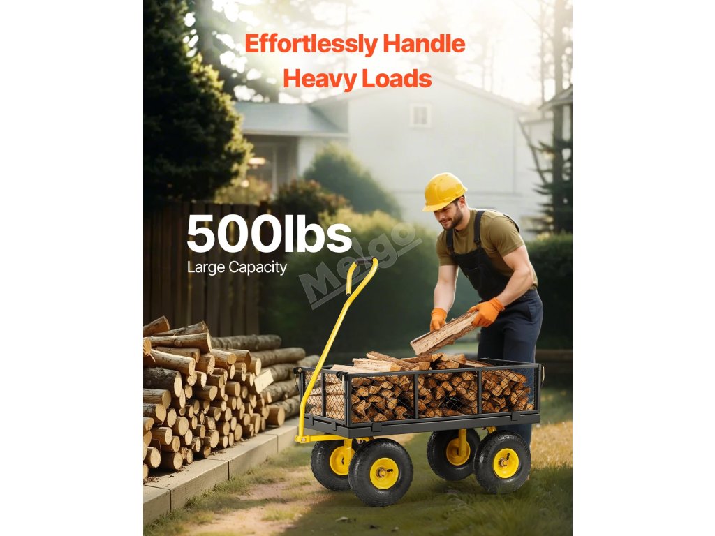 Tento ruční zahradní vozík je vyroben z oceli Q235, unese až 500 kg a má konstrukci 2 v 1, která umožňuje přepínat mezi režimem oplocení a režimem rovné podlahy. Je vybaven 10palcovými gumovými pneumatikami, které si poradí s různými terény. Ergonomická rukojeť zajišťuje pohodlné držení na zahradách, farmách, ve skladech.