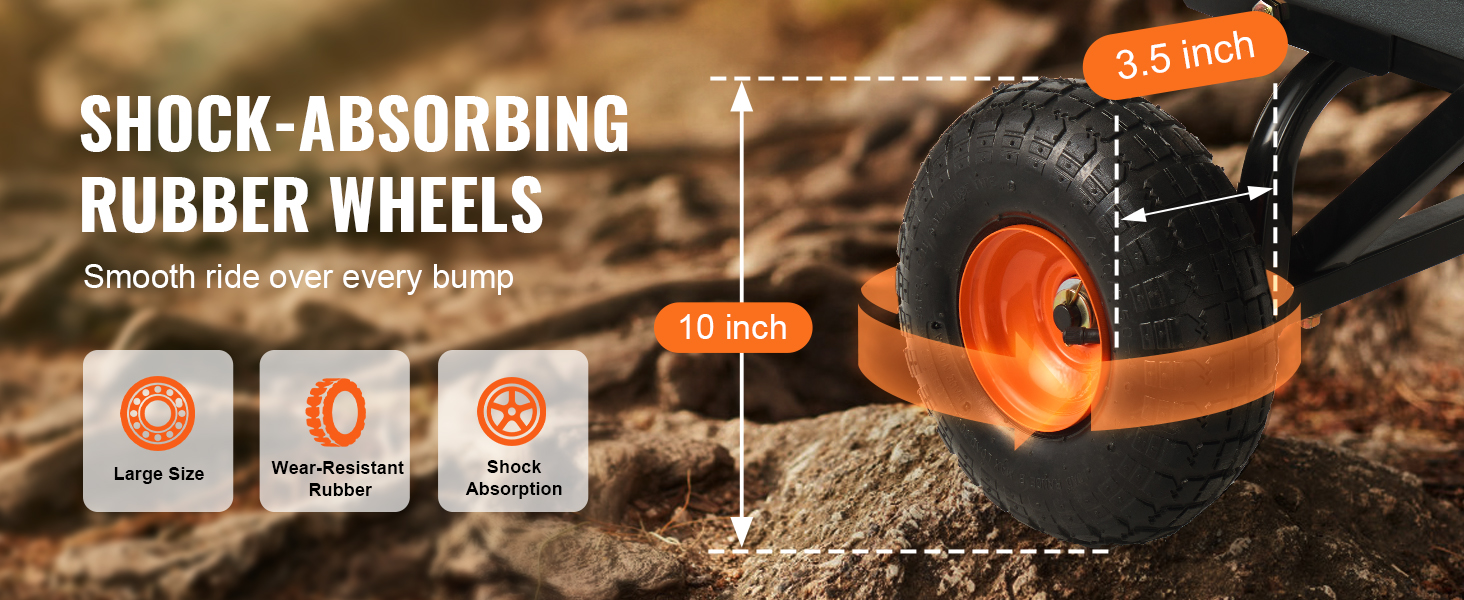 Tento zahradní vozík je vybaven velkými 10" gumovými koly, která zajišťují vynikající odolnost a tlumení nárazů a zajišťují hladký pohyb i na nerovném terénu. Díky kolečkům otočným o 360° je otáčení bezproblémové, takže přeprava je hračka.
