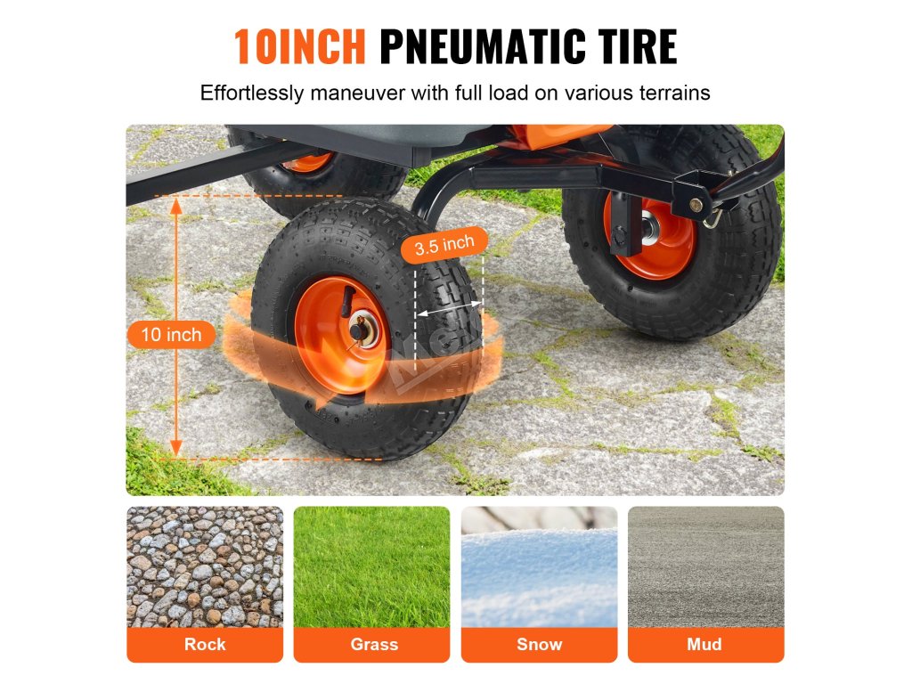 Tento zahradní vozík je vybaven velkými 10" gumovými koly, která zajišťují vynikající odolnost a tlumení nárazů a zajišťují hladký pohyb i na nerovném terénu. Díky kolečkům otočným o 360° je otáčení bezproblémové, takže přeprava je hračka.