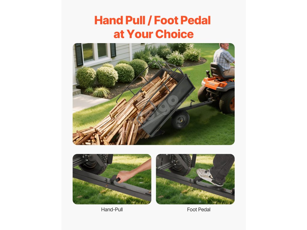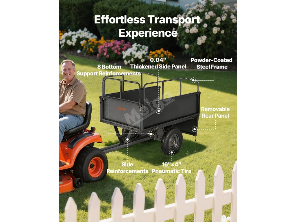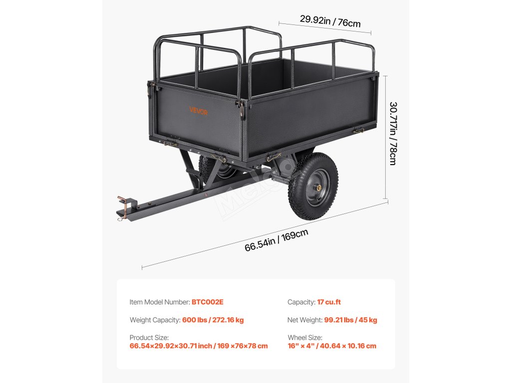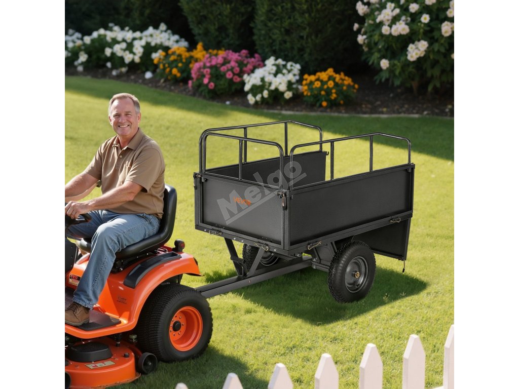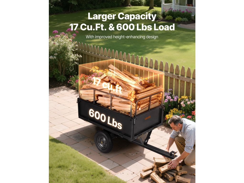 Tento zahradní přívěs o hmotnosti 600 kg je vhodný pro různá vozidla včetně traktorů, čtyřkolek a sekaček na trávu. Je vybaven ocelovým rámem, zesílenými nosnými tyčemi a pneumatikami, nabízí nosnost 500 liber a prostor o objemu 17 krychlových stop. Pneumatiky o průměru 16 palců zajišťují hladký pohyb po trávě a blátě, což umožňuje efektivní práci na zahradě.