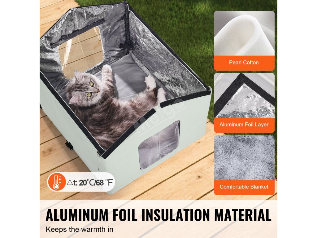 Vestavěná vyhřívací podložka a měkká deka udržují tělesnou teplotu vaší kočky na správné úrovni. Šestistranná hliníková fólie a perleťová bavlněná izolace výrazně snižují tepelné ztráty a vytvářejí teplé zimní útočiště.