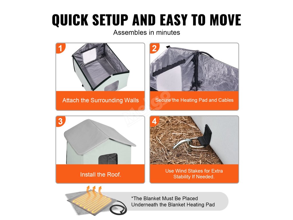Pro zajištění bezpečnosti venku je vyhřívaný domek pro kočky navržen se 4 větruvzdornými kolíky pro stabilní uzemnění na trávě nebo v blátě. Obklopen trubkami z PP poskytuje pevnou oporu a zajišťuje vaší kočce bezpečné útočiště.