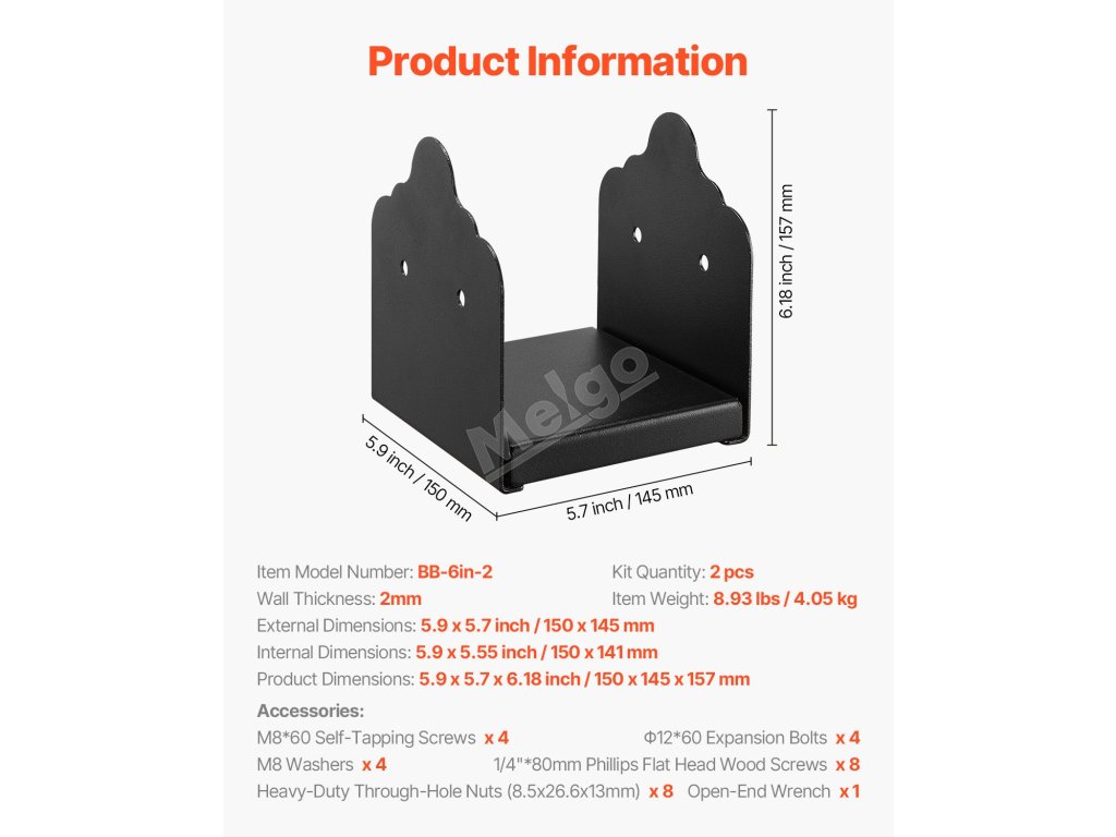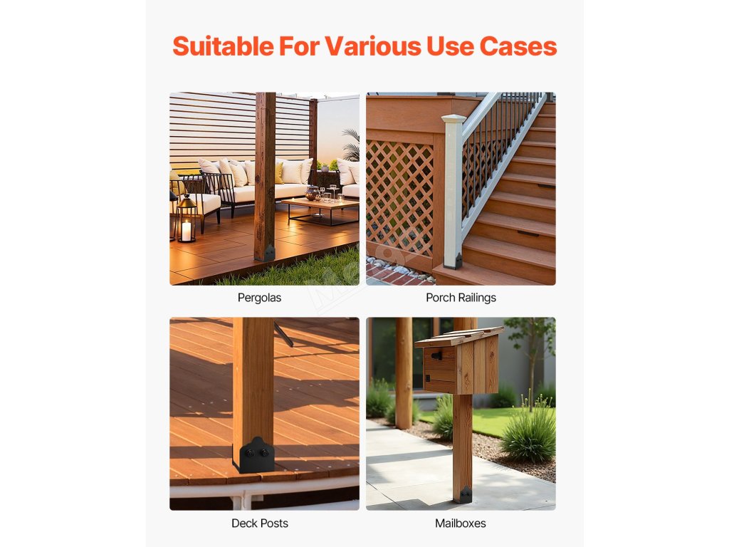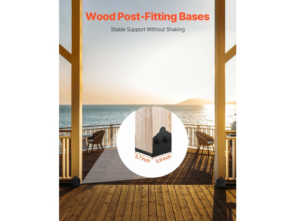 Základna sloupku je vyrobena z odolné uhlíkové oceli, která je odolná proti korozi a poskytuje stabilní oporu. Silný spodní kryt chrání dřevěné sloupky před přímým kontaktem se zemí a zabraňuje jejich rozpadu a deformaci. Díky širokému příslušenství se snadno instaluje na mnoho povrchů a je ideální pro zábradlí verand, pergol a sloupků.