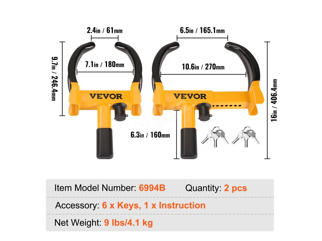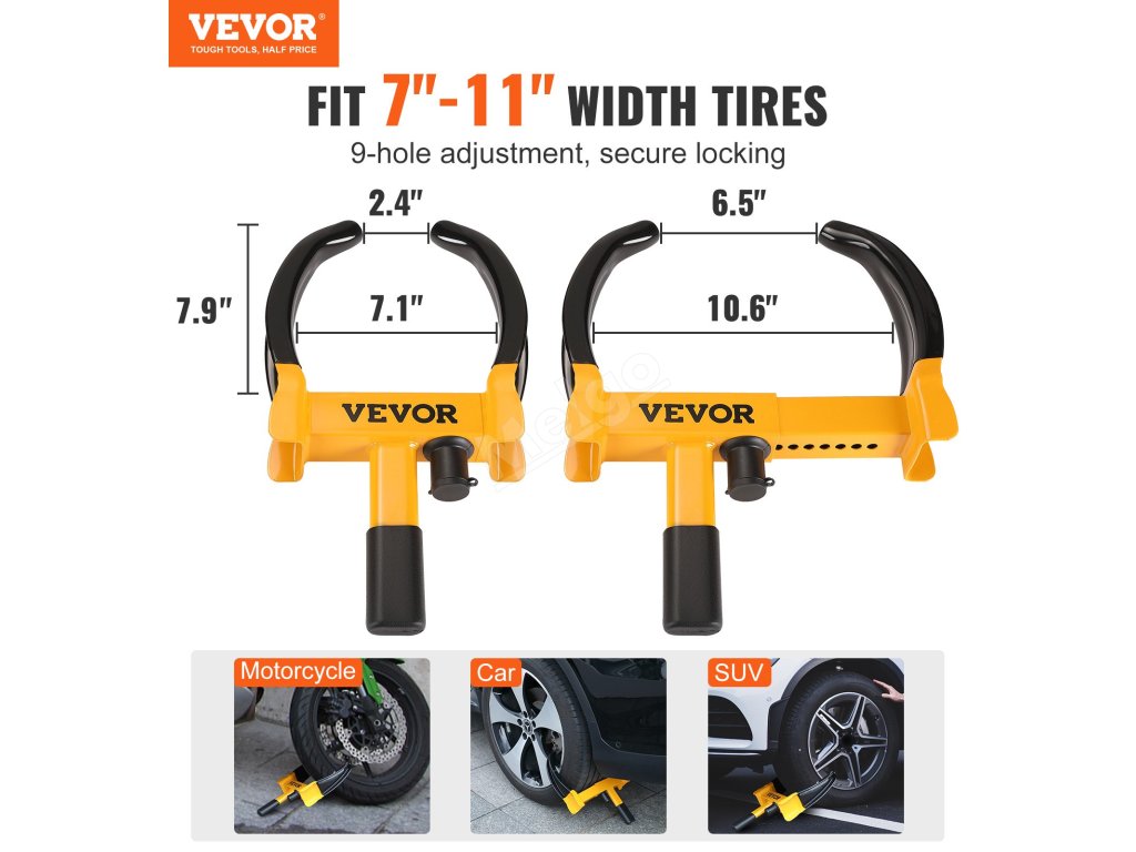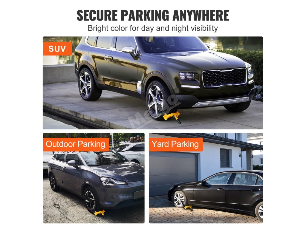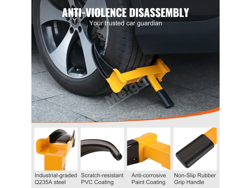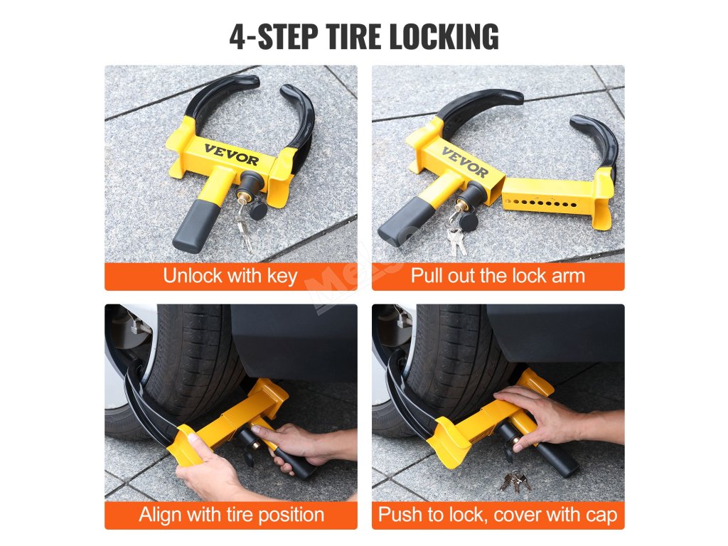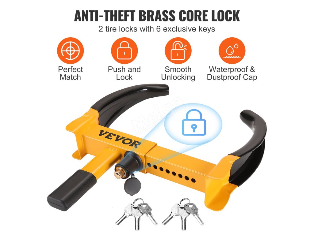 Zámek kol VEVOR zajišťuje bezpečnost vašeho vozidla kdykoli a kdekoli. Zabraňuje krádeži pneumatik a vozidla. Každý zámek pneumatik je vybaven PVC polštářovým krytem, který zajišťuje bezpečnost vozidla a ochranu pneumatik/houby a snižuje riziko poškrábání.