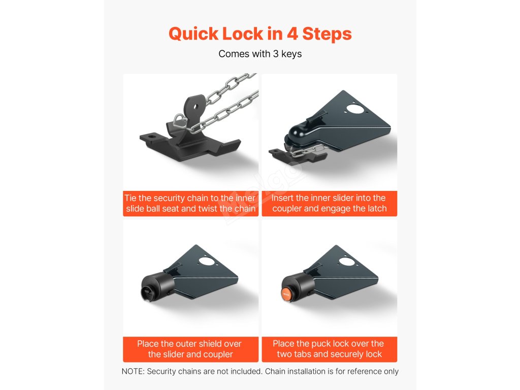 Tento zámek závěsu se snadno používá, 3 klíče jsou součástí dodávky a je vhodný pro obytné vozy, přívěsy, lodě a další vozidla. Jednoduše jej uzamkněte na spojovacím zařízení a zabezpečte své vozidlo před rizikem krádeže, čímž získáte klid na duši.
