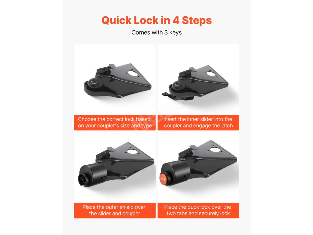 Tento zámek závěsu se snadno používá, 3 klíče jsou součástí dodávky a je vhodný pro obytné vozy, přívěsy, lodě a další vozidla. Jednoduše jej uzamkněte na spojovacím zařízení a zabezpečte své vozidlo před rizikem krádeže, čímž získáte klid na duši.