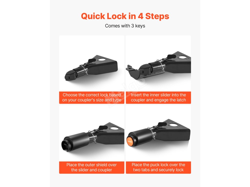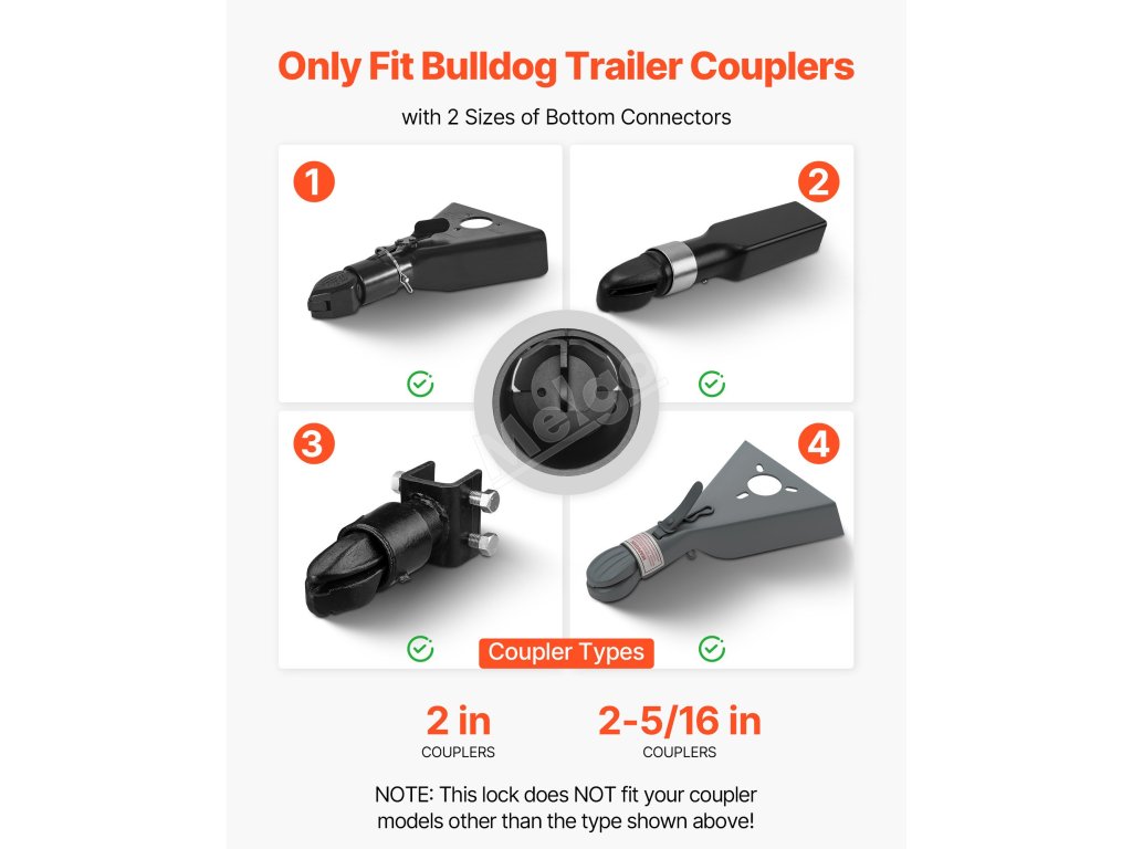 Tento zámek přívěsu je vhodný pro spřáhla typu 2 a 2-5/16 palce. Poznámka: Před nákupem si prosím prohlédněte obrázky, abyste se ujistili, že odpovídá vašemu spřáhlu, a zajistili tak přesné uchycení!