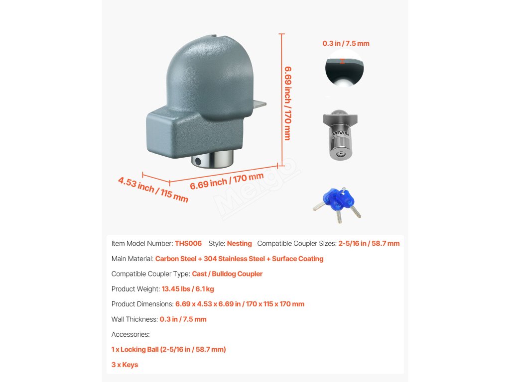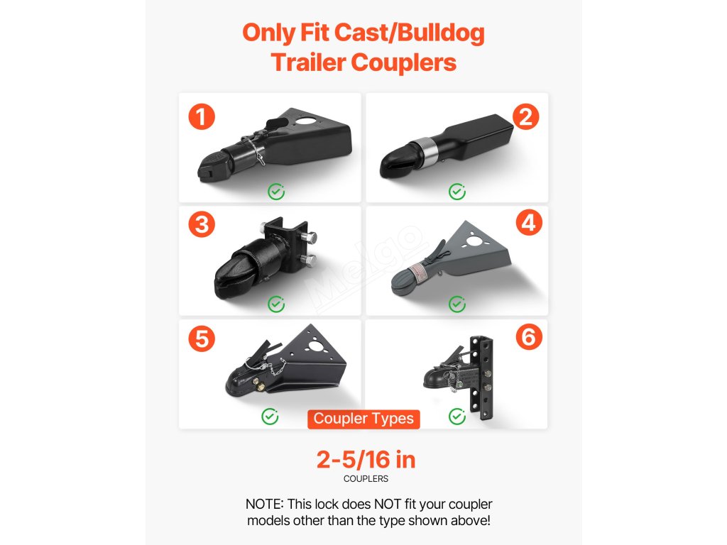 Tento zámek přívěsu je vhodný pro 2-5/16palcová litá/bulldogová spřáhla. Poznámka: Před nákupem si prosím prohlédněte obrázky, abyste se ujistili, že odpovídá vašemu spřáhlu, a zajistili tak přesné uchycení!