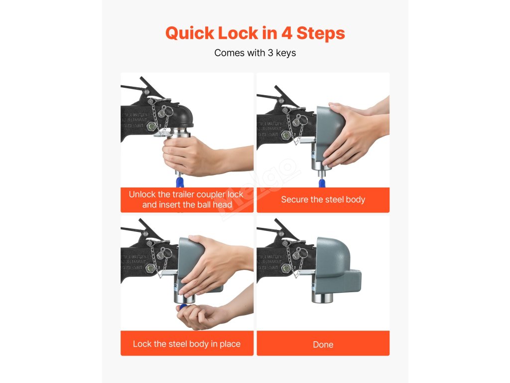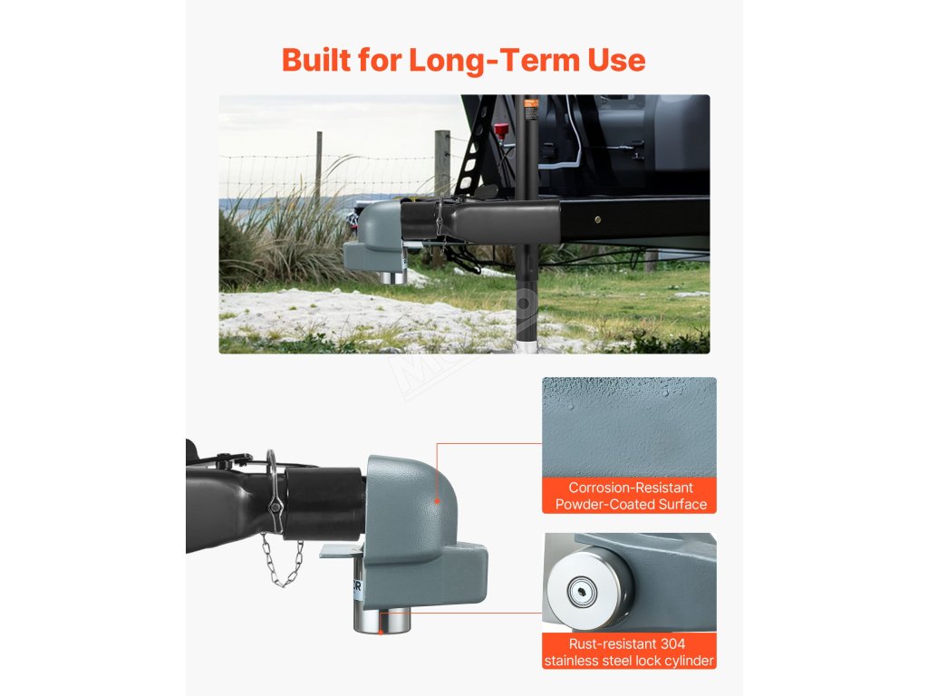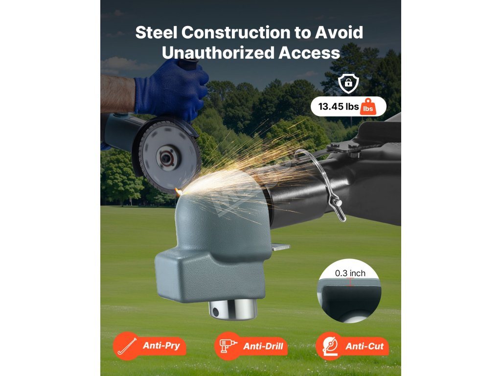 Náš 13,45 kg těžký zámek spojky je vyroben z vysokopevnostní uhlíkové oceli, takže je odolný a bezpečný pro váš přívěs nebo obytný vůz. Zabezpečte své vozidlo před krádeží, když je zaparkované venku!