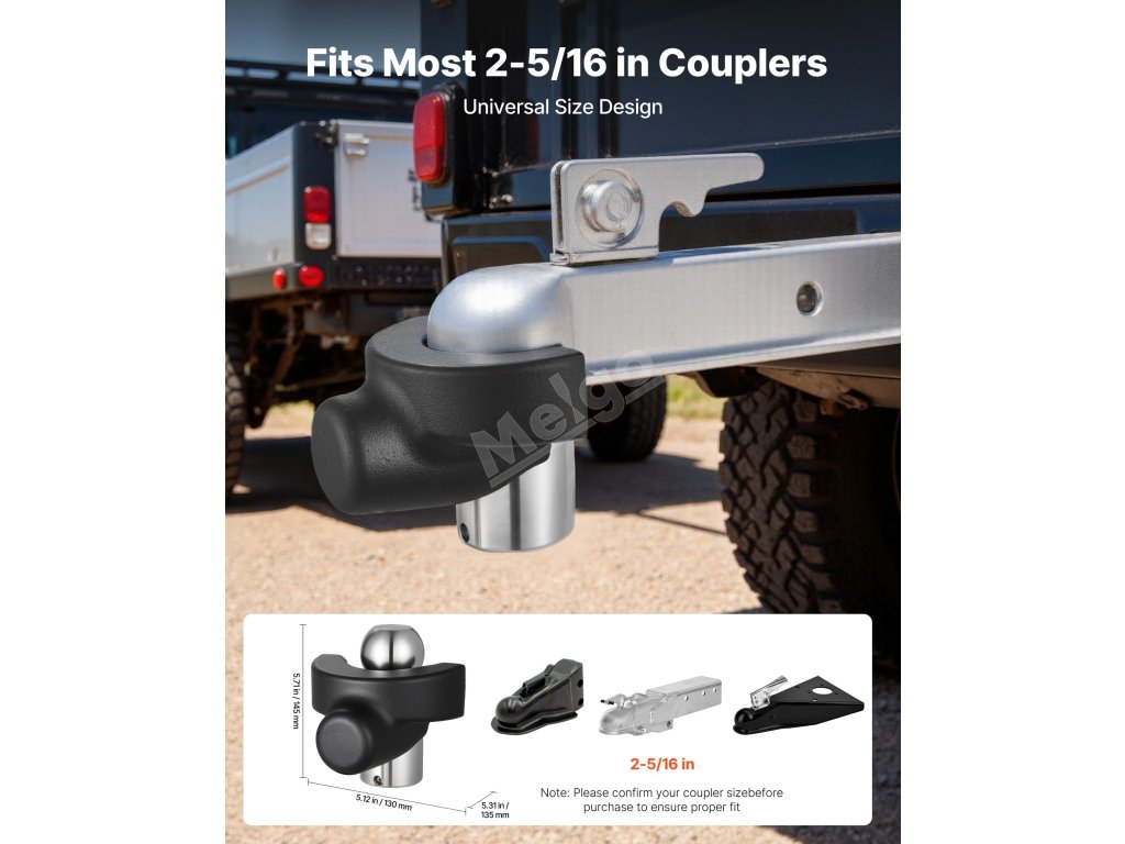 Náš zámek závěsu přívěsu je kompatibilní se závěsy přívěsů o průměru 2-5/16 palců, což umožňuje široké možnosti přizpůsobení. Před nákupem si prosím zkontrolujte velikost svého spřáhla, abyste se ujistili, že zámek vyhovuje vašemu přívěsu.