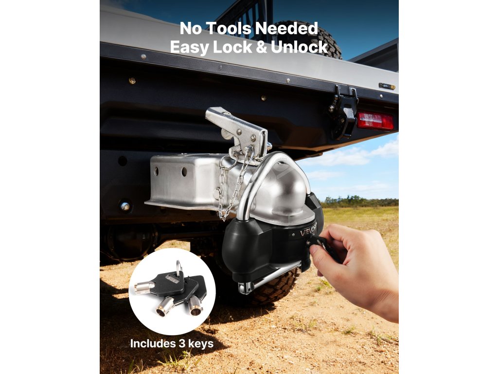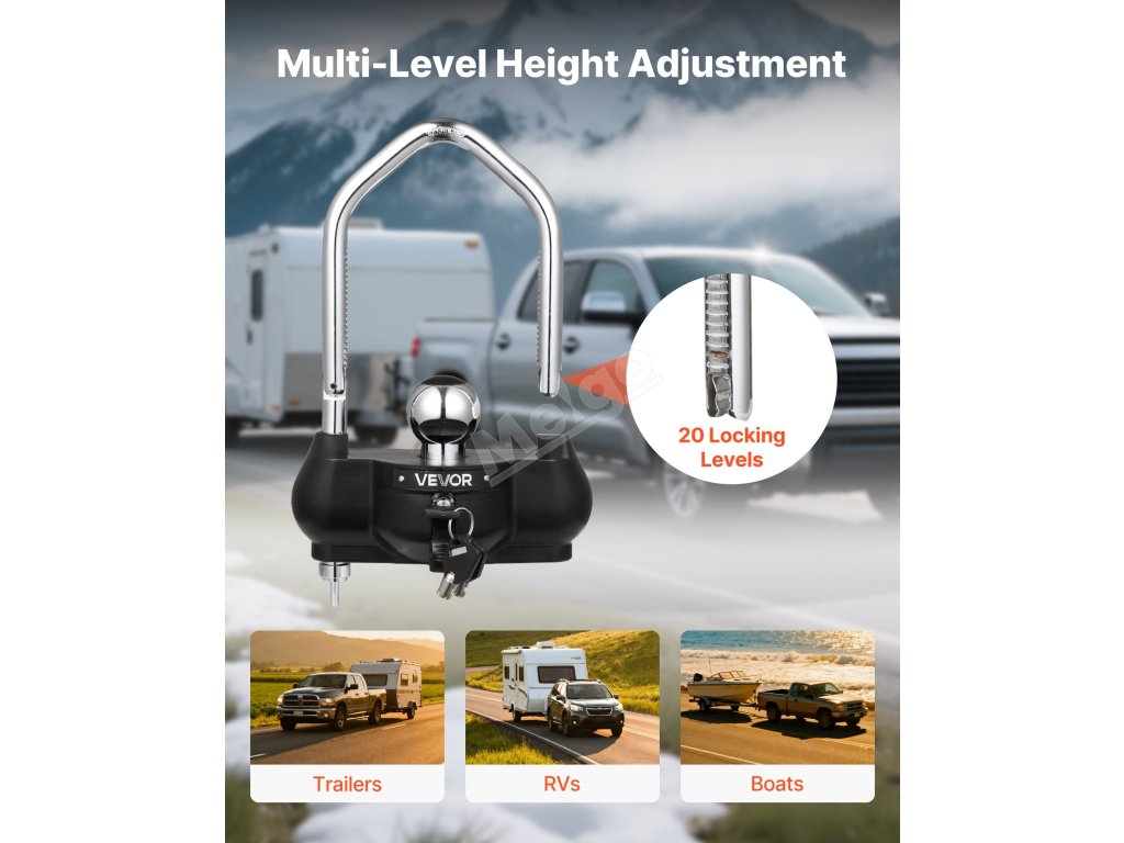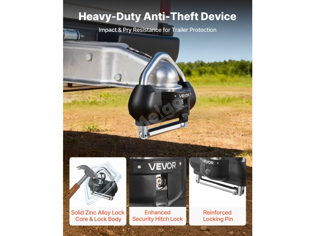 Tento univerzální zámek kulového závěsu je vhodný pro řadu běžných spojovacích prvků. Je vyroben z odolné slitiny s antikorozní povrchovou úpravou a zaručuje dlouhodobou pevnost a odolnost vůči náročným podmínkám. Jeho jedinečná konstrukce proti krádeži zabraňuje vypáčení a nárazům, zatímco jeho jednoduché ovládání usnadňuje zamykání a odemykání.
