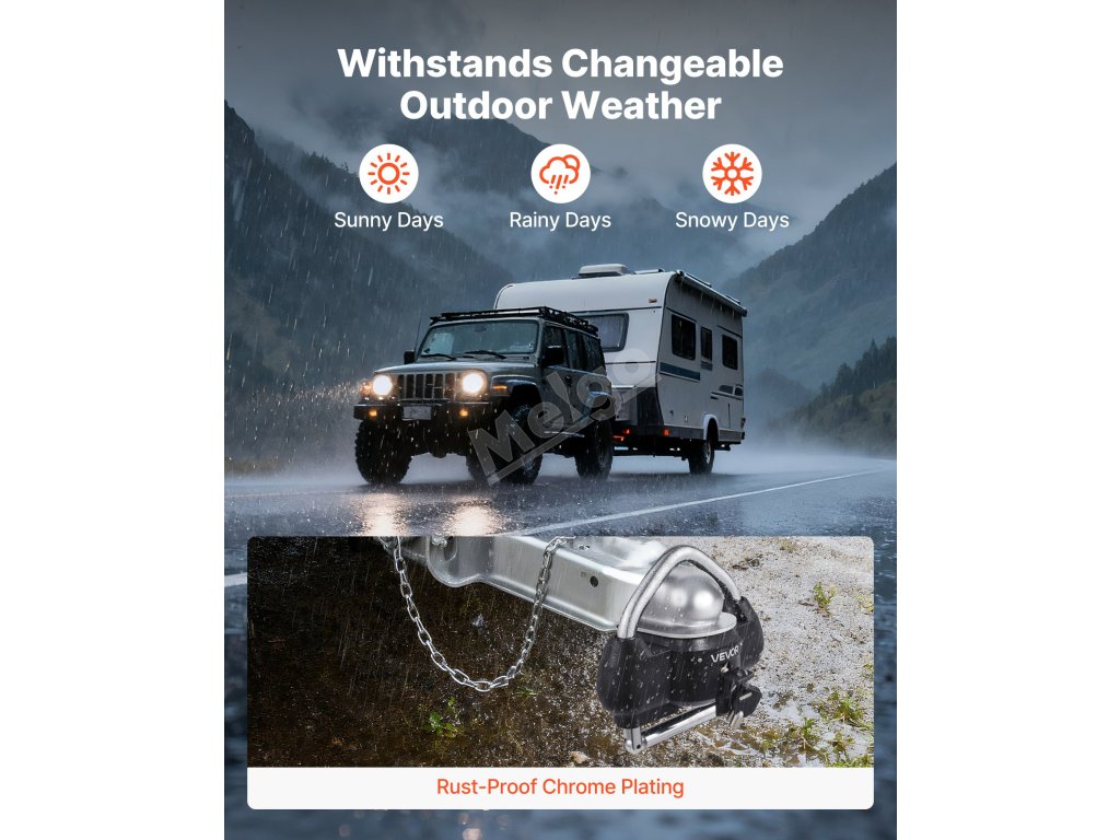 Tento kulový zámek přívěsu je vyroben z odolné zinkové slitiny a má pevnou konstrukci, která je odolná proti deformacím nebo zlomení. Jeho pochromovaný povrch odolává korozi a rzi, takže je přizpůsoben různým náročným podmínkám. Vysoce pevná konstrukce zabraňuje zaseknutí a nárazu, čímž zajišťuje bezpečnost vašeho přívěsu.