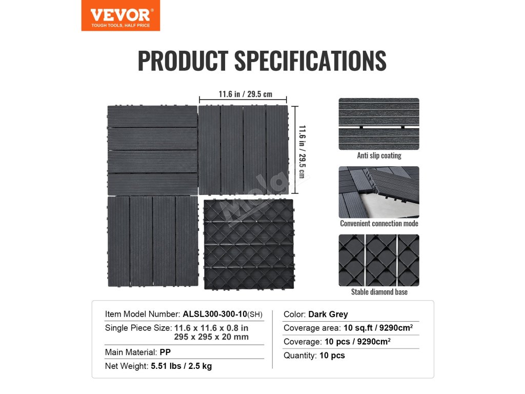 | Veľkosť jedného kusu | 11.8 x 11,8 x 0,8 palca / 300 x 300 x 20 mm |