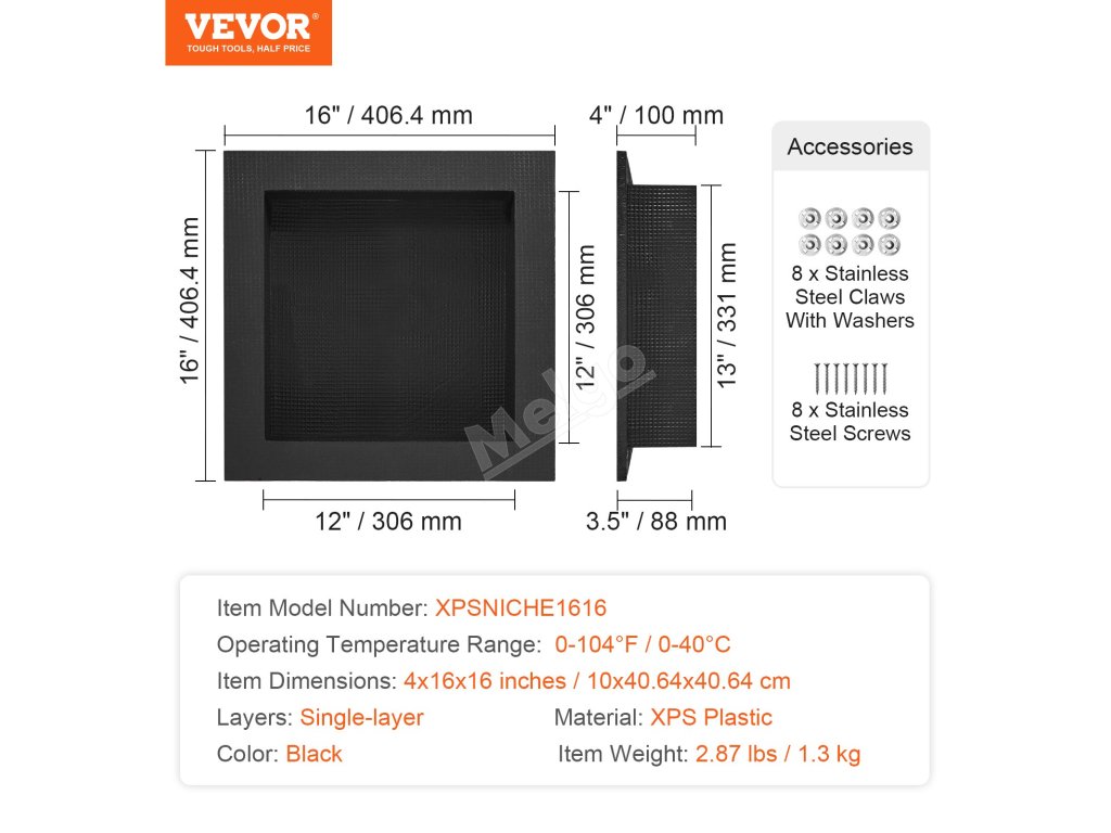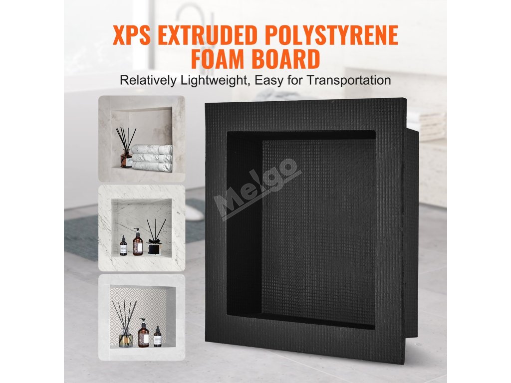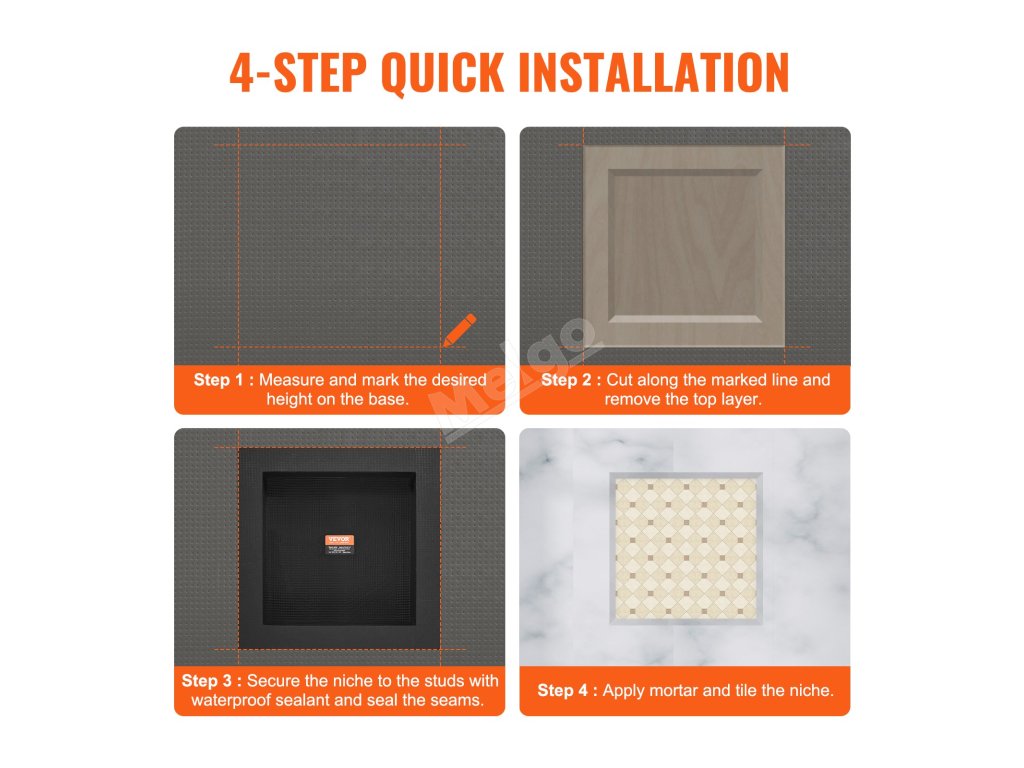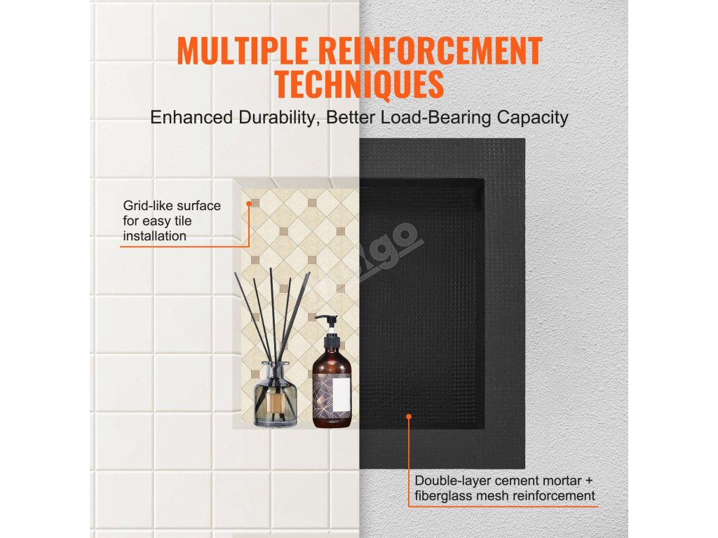 Proces zpevnění povrchu sprchové niky VEVOR, který vede k lepší nosnosti, vhodný pro jakékoliv lepidlo na dlaždice, snadná instalace dlaždic. Zdarma je k dispozici instalační sada pro vodorovnou nebo svislou zapuštěnou instalaci.