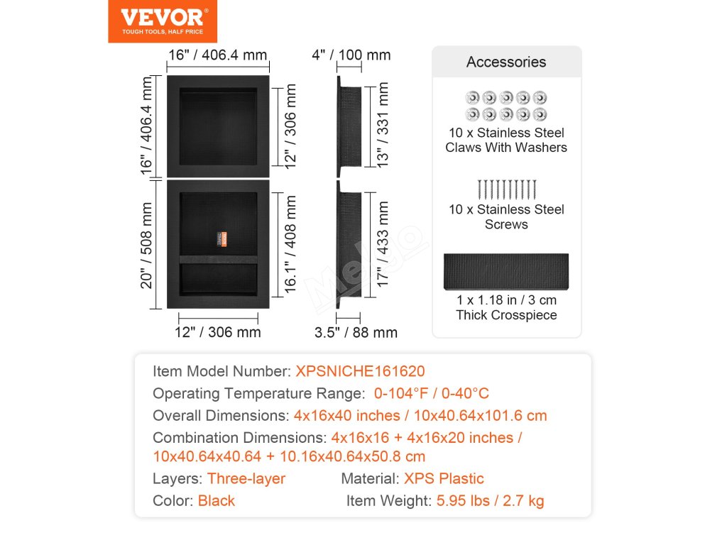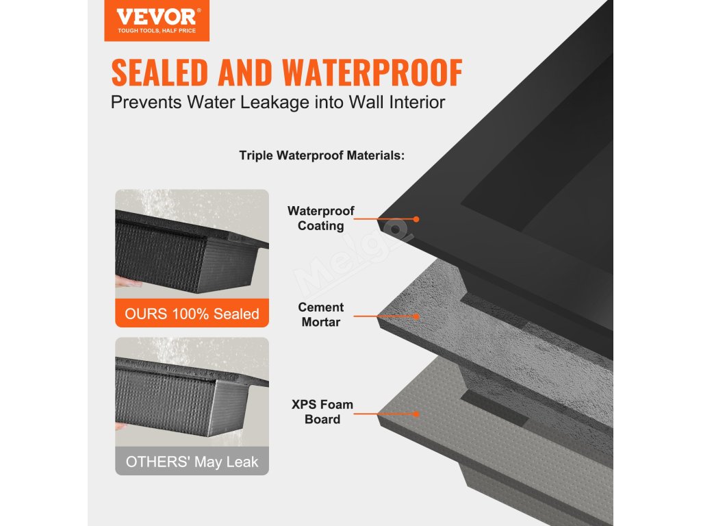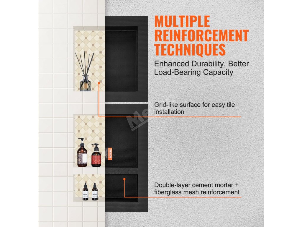 Proces zpevnění povrchu sprchové niky VEVOR, který vede k lepší nosnosti, vhodný pro jakékoliv lepidlo na dlaždice, snadná instalace dlaždic. Zdarma je k dispozici instalační sada pro vodorovnou nebo svislou zapuštěnou instalaci.