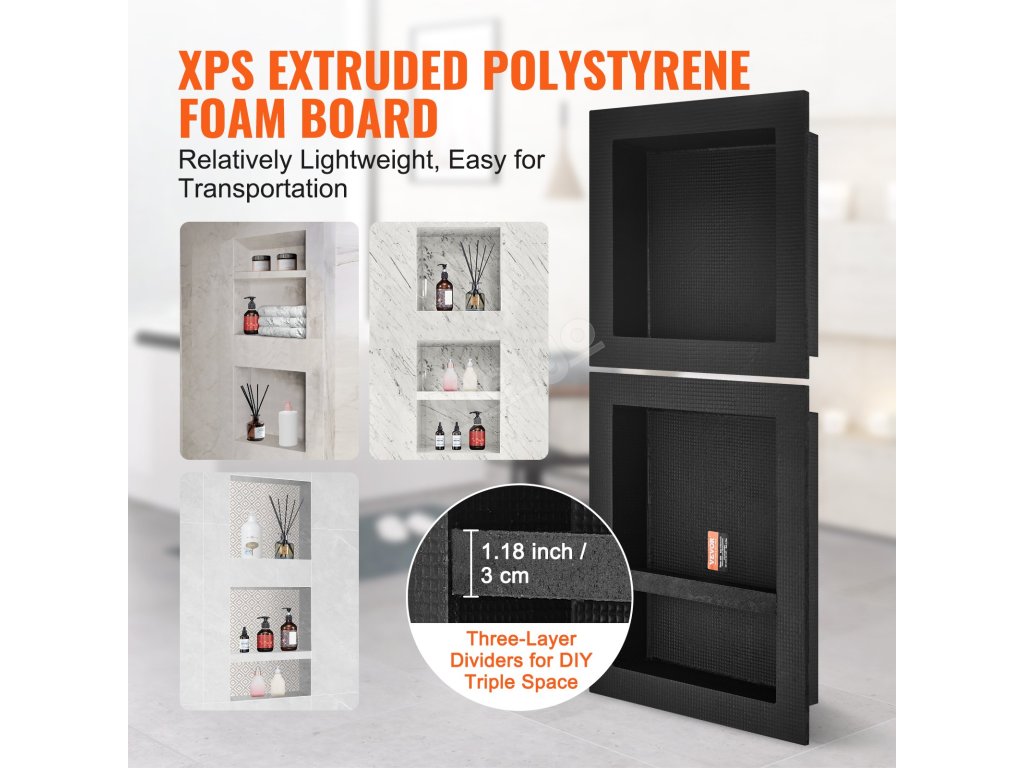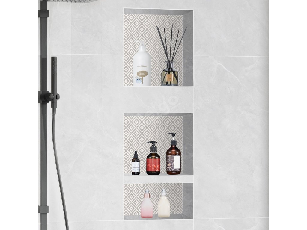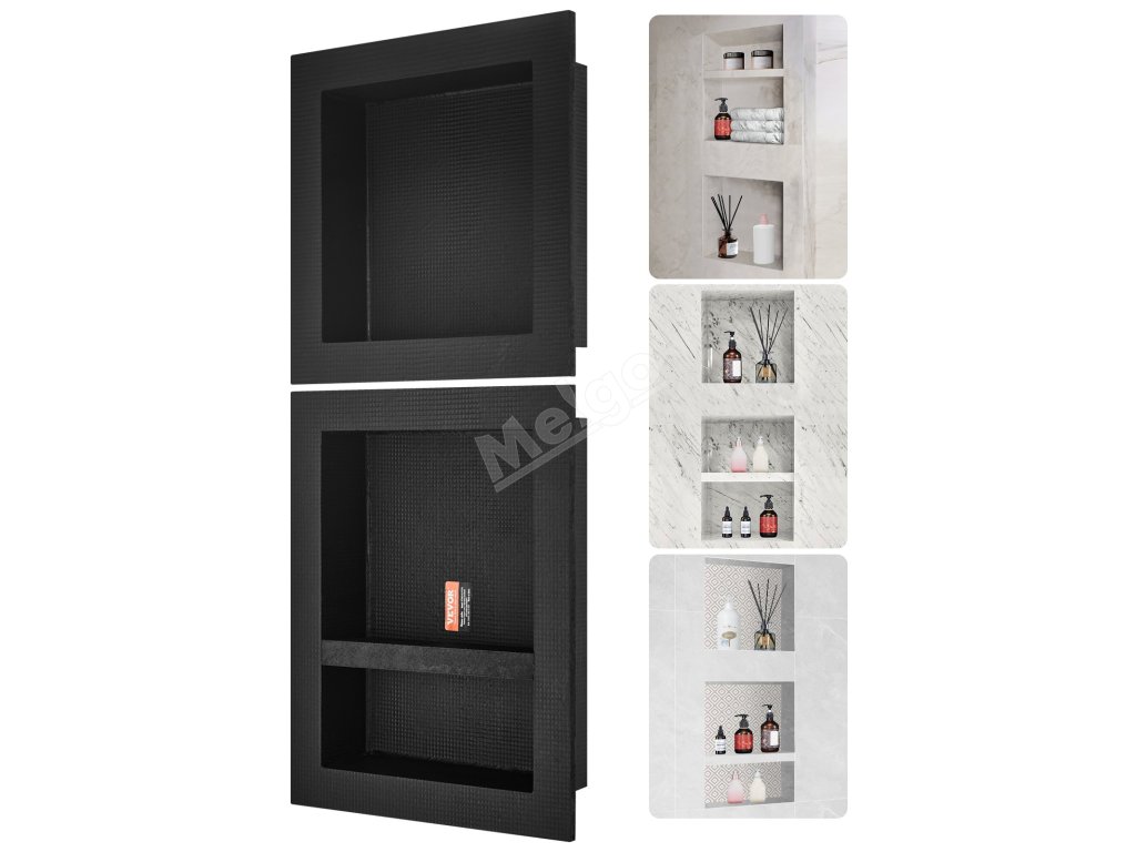 Výklenek lze instalovat vodorovně nebo svisle, což je vhodné zvolit podle uspořádání sprchy a osobních preferencí, aby vyhovoval různým prostorovým potřebám - je umístěn uvnitř stěn, aby se ušetřilo místo v koupelně.
