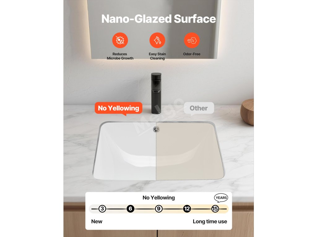 Toto keramické koupelnové umyvadlo, vypalované při vysokých teplotách, je potaženo vrstvou nano glazury, která odolává skvrnám od vody, mýdlové vodě a poškrábání. V průběhu času zůstává lesklé a hladké, takže každodenní čištění je rychlé a bez námahy.