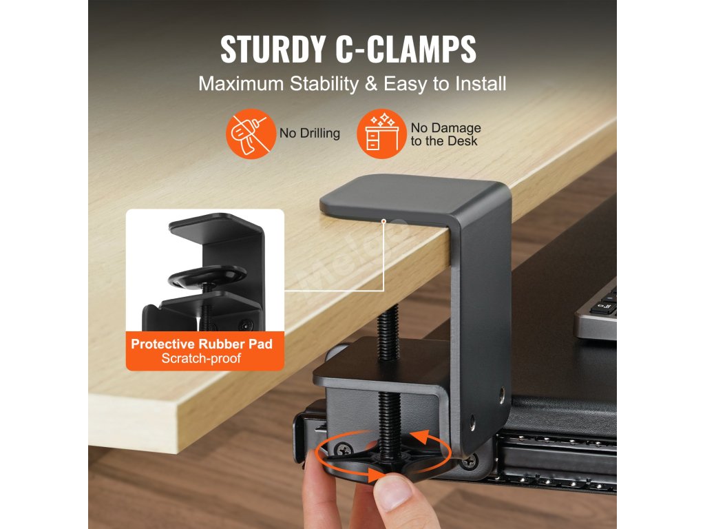 Konstrukce s C-šroubem naší přihrádky na klávesnici umožňuje bezproblémové připevnění na jakoukoli desku o tloušťce menší než 2,4 palce bez vrtání nebo poškození stolu. Upozorňujeme, že náš zásobník není vhodný pro stoly s nosníky ve spodní části, zkosenými nebo zvýšenými hranami.