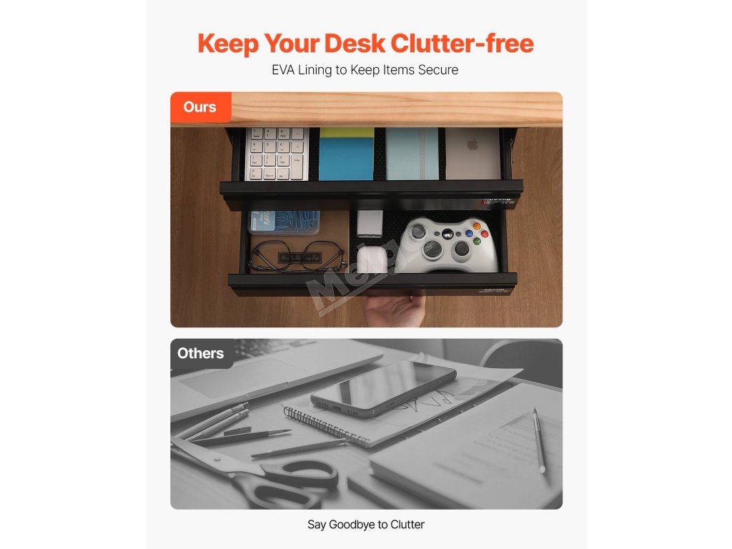 Tato zásuvka pod stolem má dvě úrovně, každá s nosností 11 kg. Poskytuje skrytý úložný prostor pro uspořádání různých předmětů, což vám pomůže odstranit nepořádek na pracovním stole a udržet produktivitu vašeho pracovního místa. Už žádný nepořádek na povrchu - mějte vše potřebné na dosah.