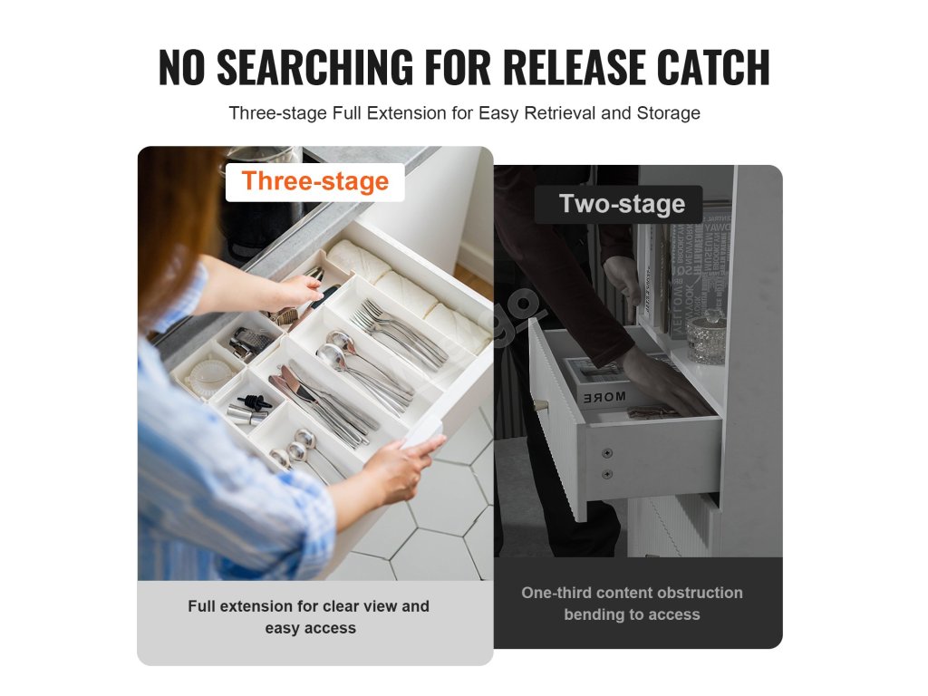 Naše výsuvy zásuvek mají výjimečnou nosnost 100 kg pro bezstarostné skladování. Jsou vybaveny zesílenou pozinkovanou ocelí, tichým tichým zavíráním, třístupňovým plným výsuvem a automatickým odskokem, což představuje dokonalou kombinaci vynikající kvality a snadného používání.