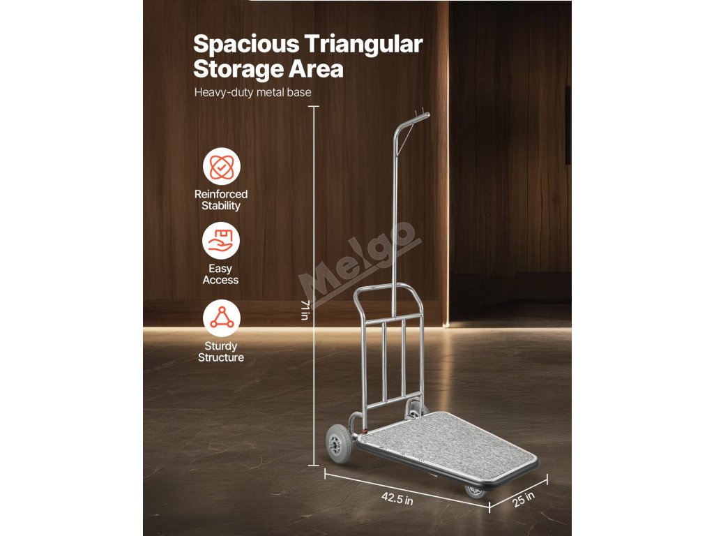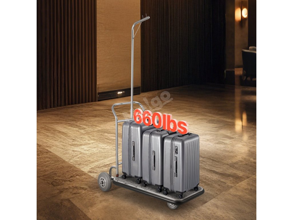 Tento zvonkový vozík je vyroben z 1 mm silného rámu z nerezové oceli, který mu umožňuje zachovat si lesk. Odolná základna, jedno 5palcové a dvě 8palcová gumová kola zajišťují hladký a stabilní pohyb i při plném zatížení.