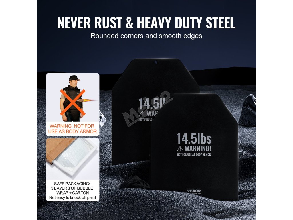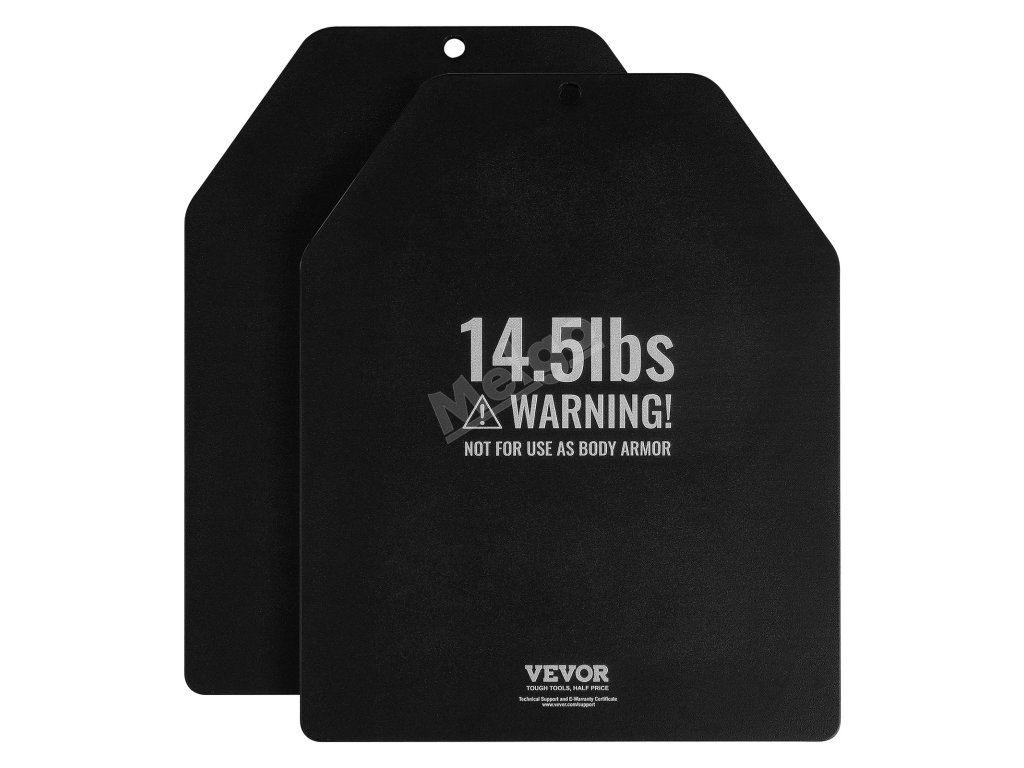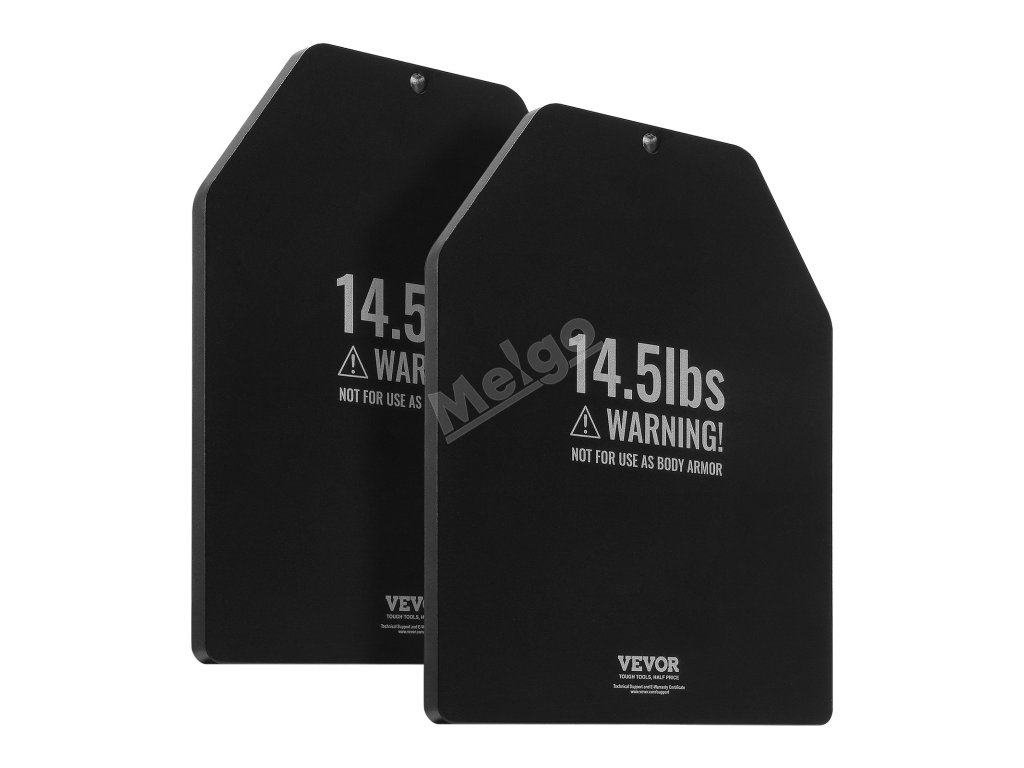 Tyto zátěžové desky jsou vyrobeny z odolné oceli se zaoblenými rohy a hladkými hranami a jsou konstruovány na dlouhou dobu. Pro větší ochranu jsou zabaleny do tří vrstev bublinkové fólie. Poznámka: Nejsou určeny k použití jako neprůstřelné vesty.